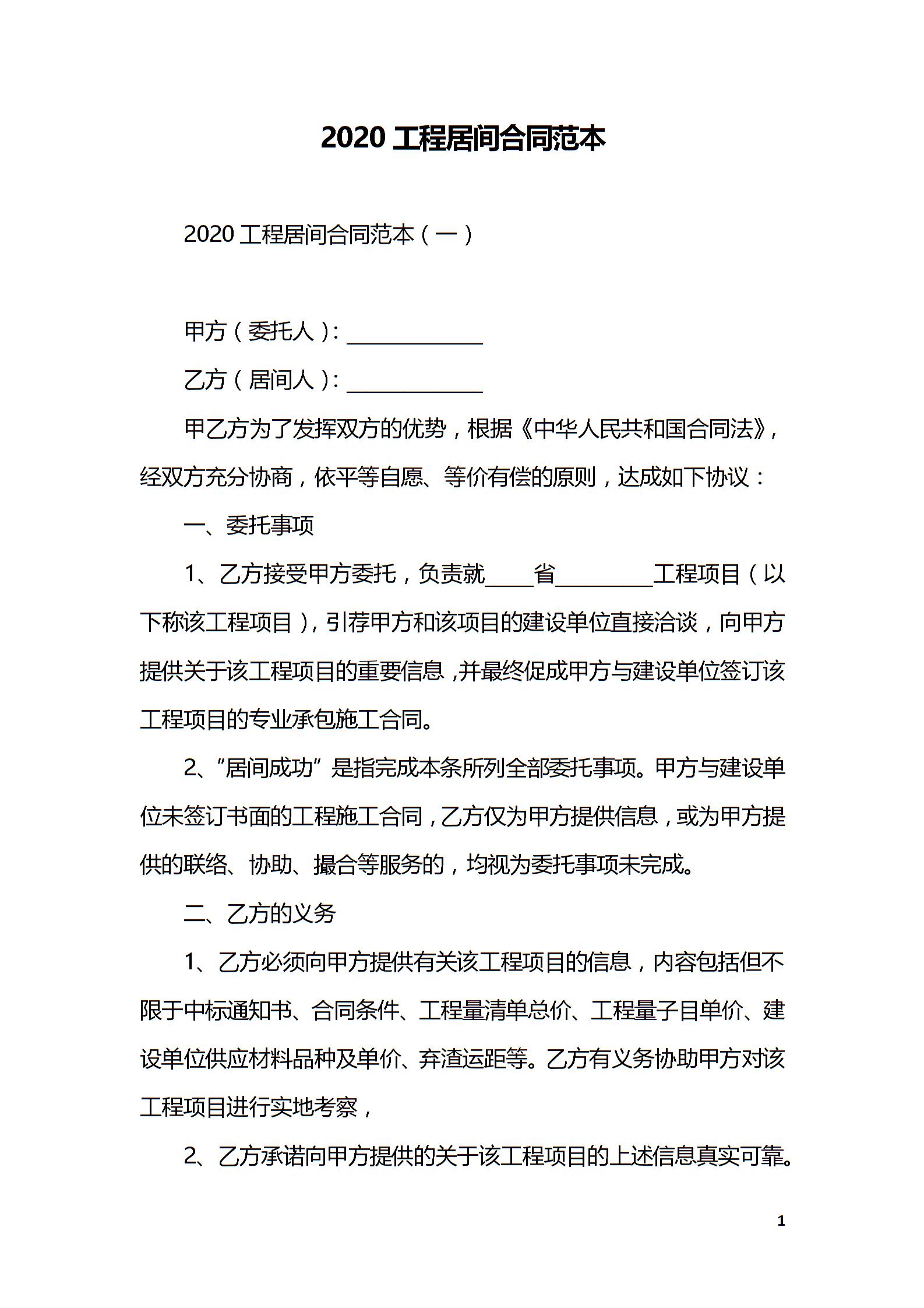 2020工程居间合同范本