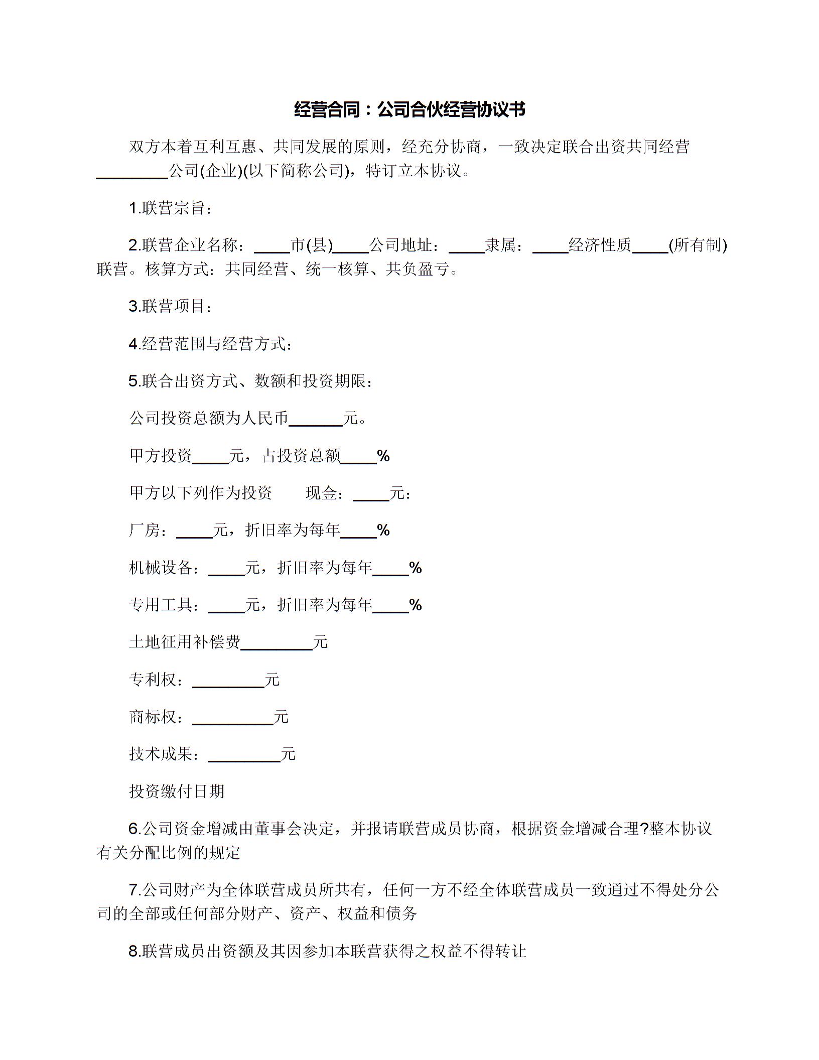 公司合伙经营合同样本