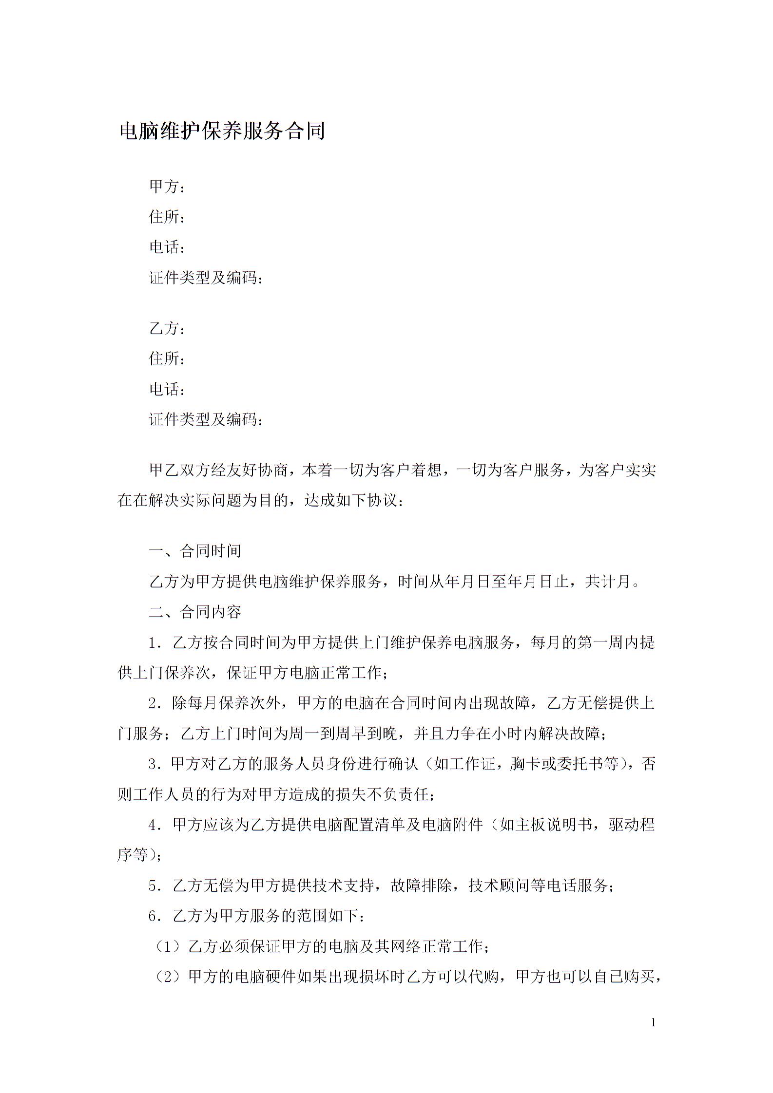 电脑维护保养服务合同范文