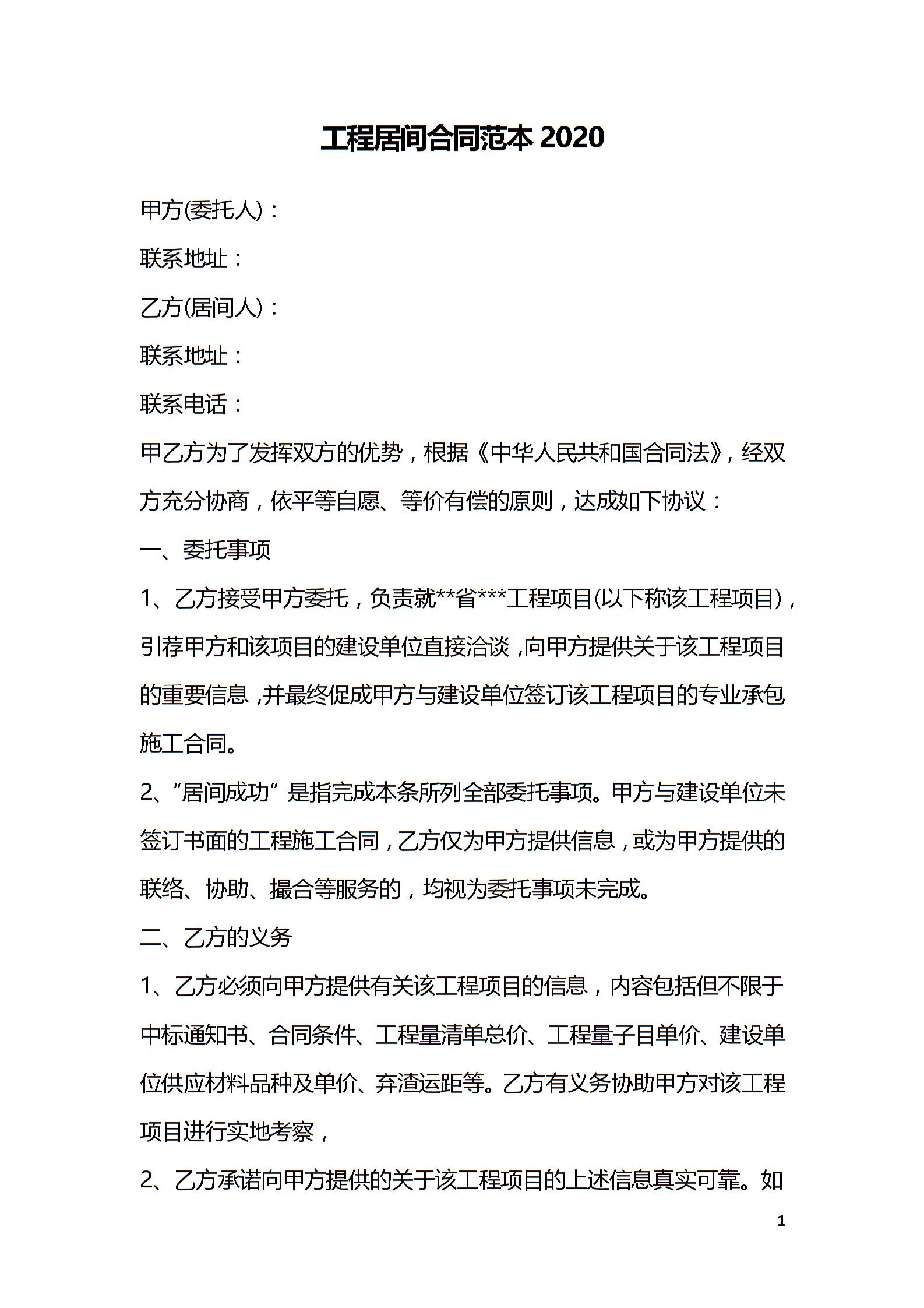 工程居间合同范本2020