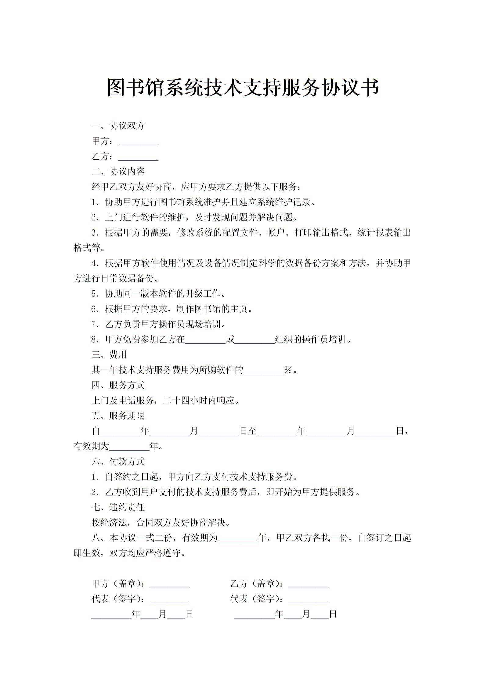 图书馆系统技术支持服务协议书范文