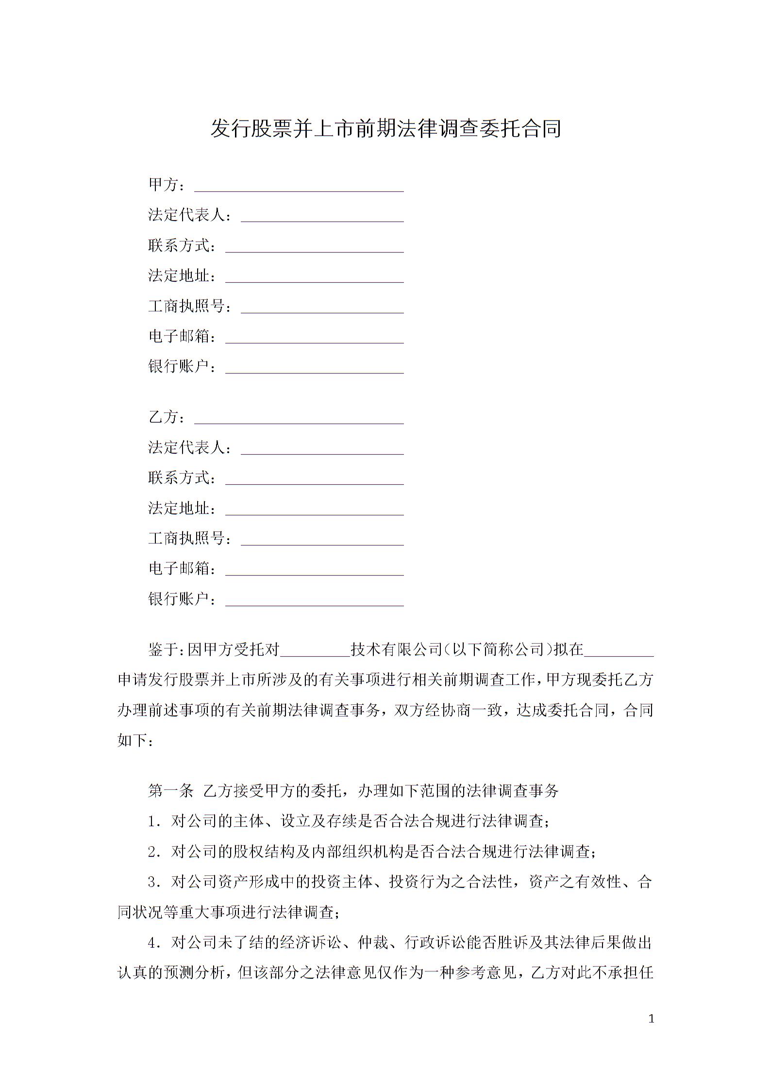 发行股票并上市前期法律调查委托合同