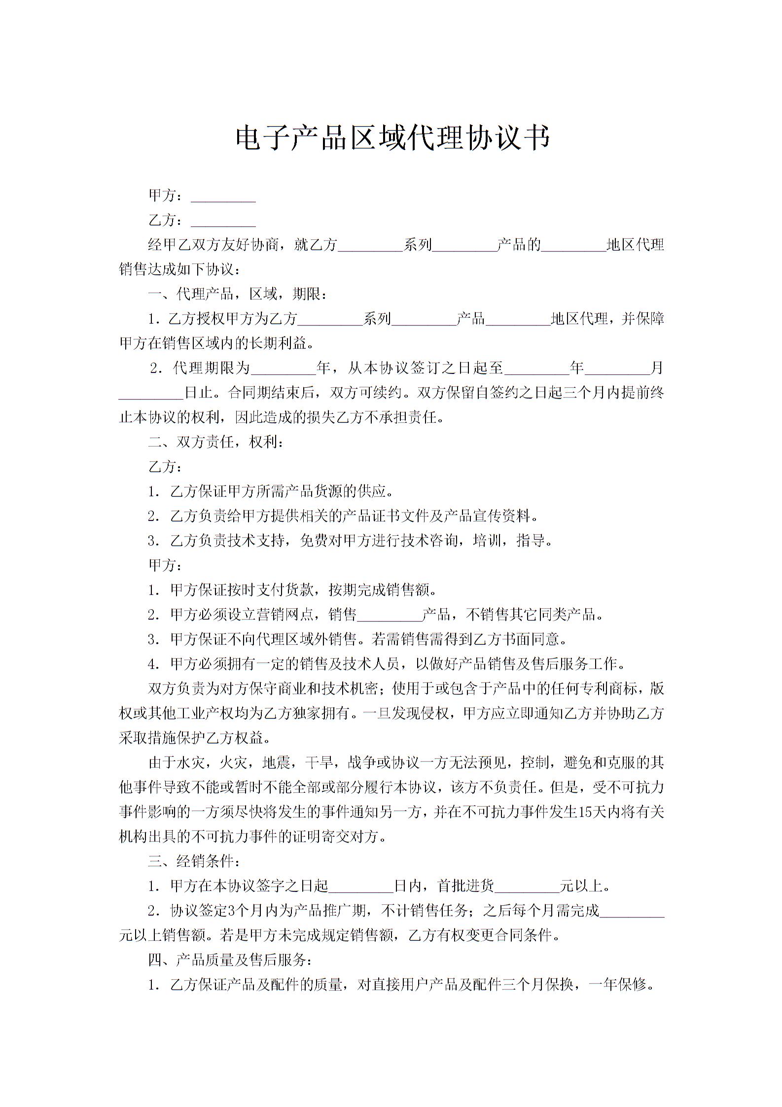电子产品区域代理协议书范文
