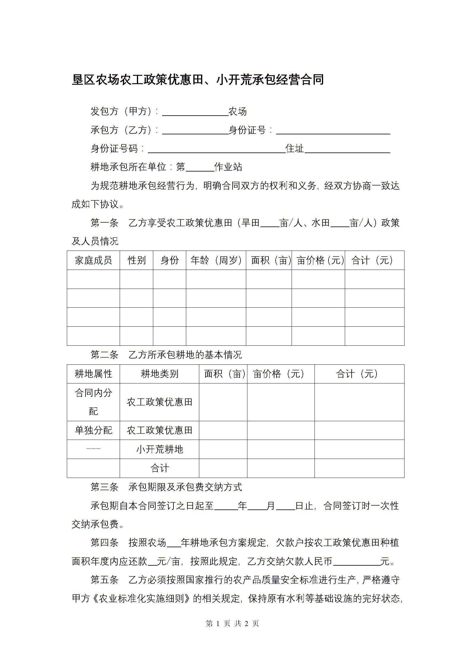 垦区农场农工政策优惠田、小开荒承包经营合同