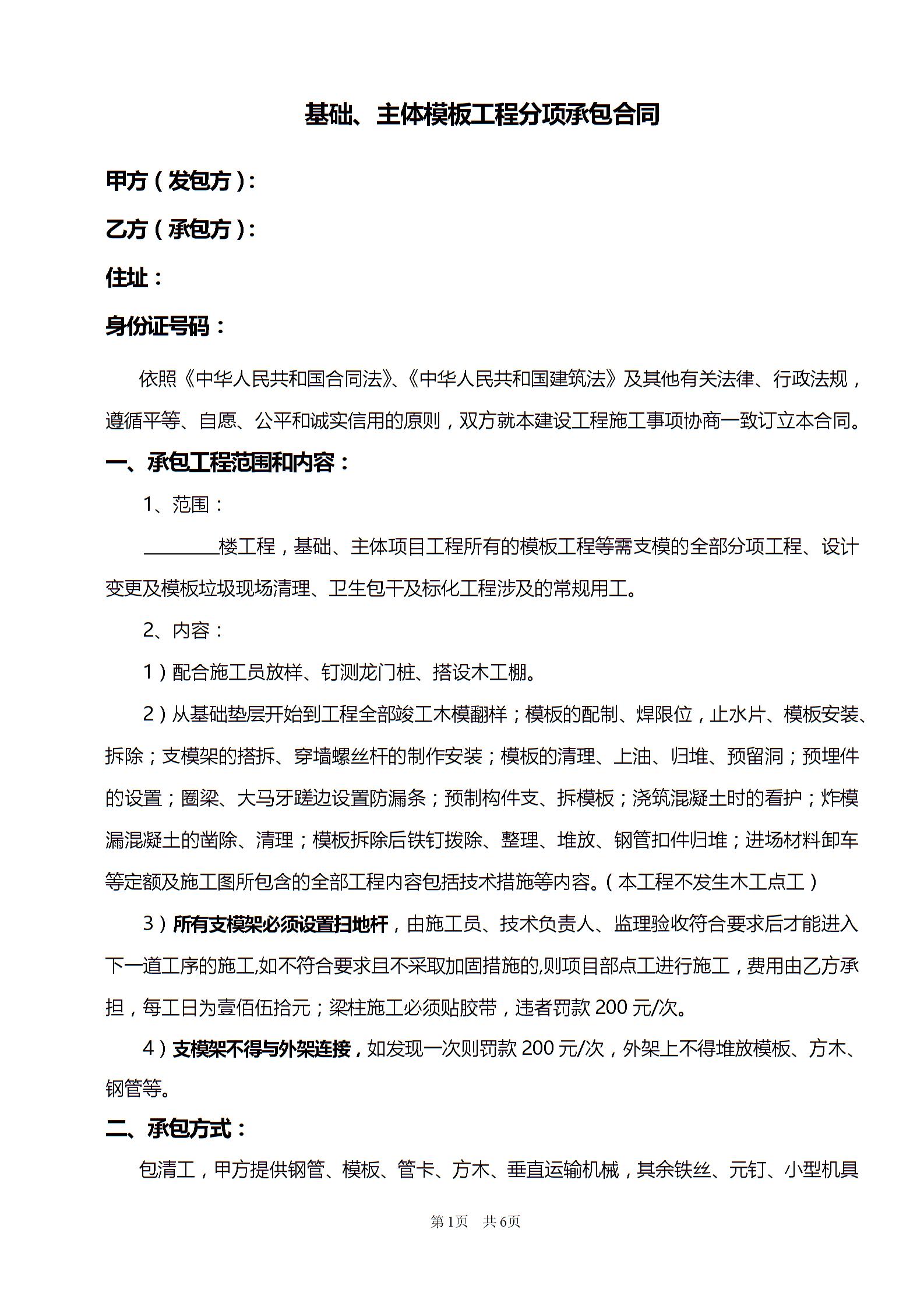 工程分项承包合同模板
