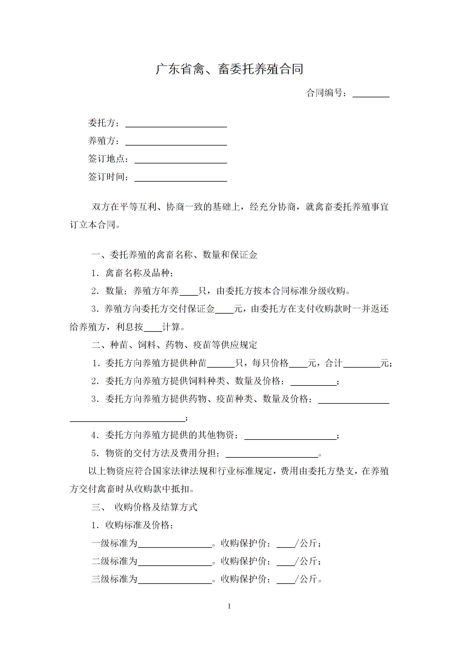 广东省禽、畜委托养殖合同