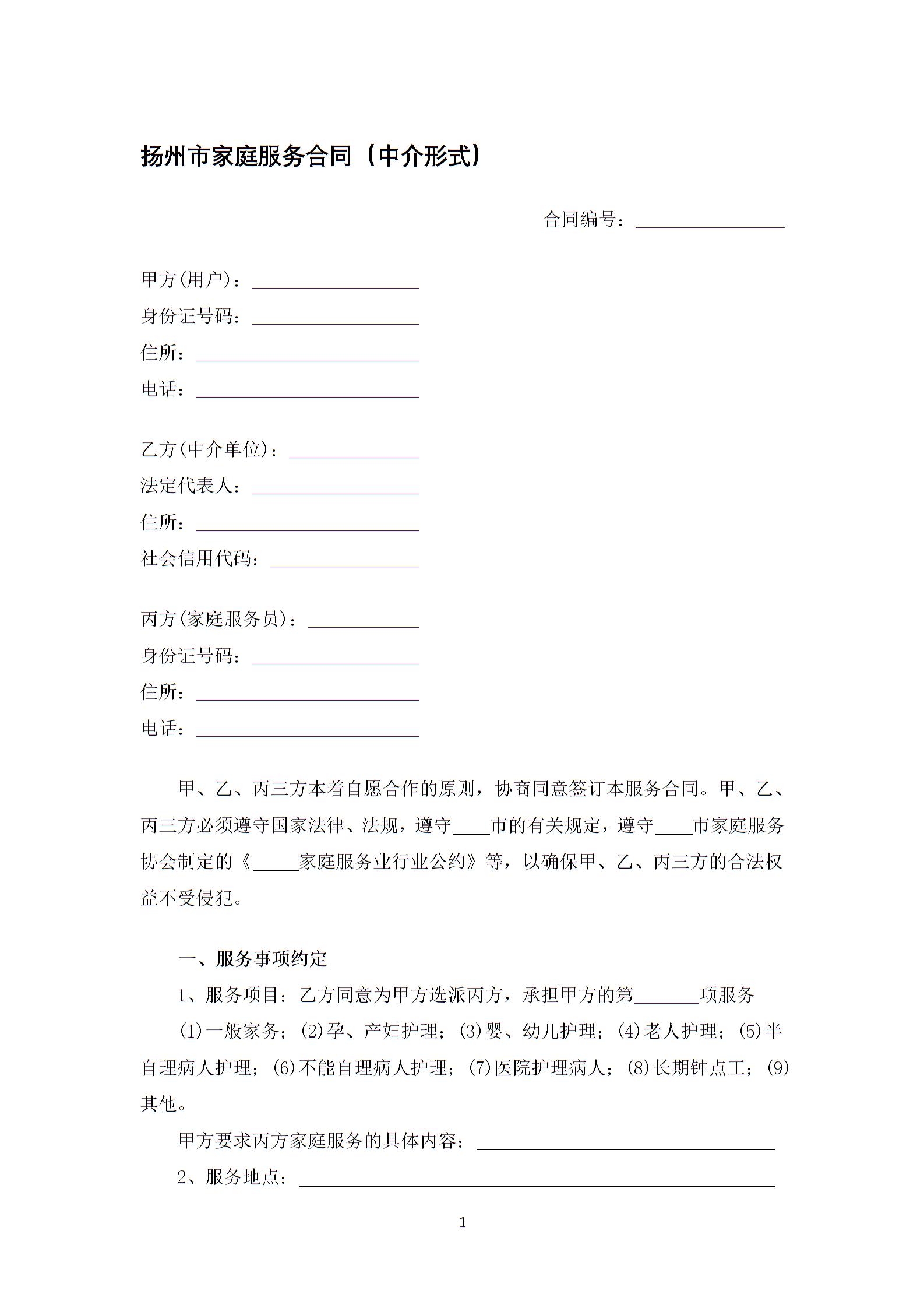 扬州市家庭服务合同(中介形式)