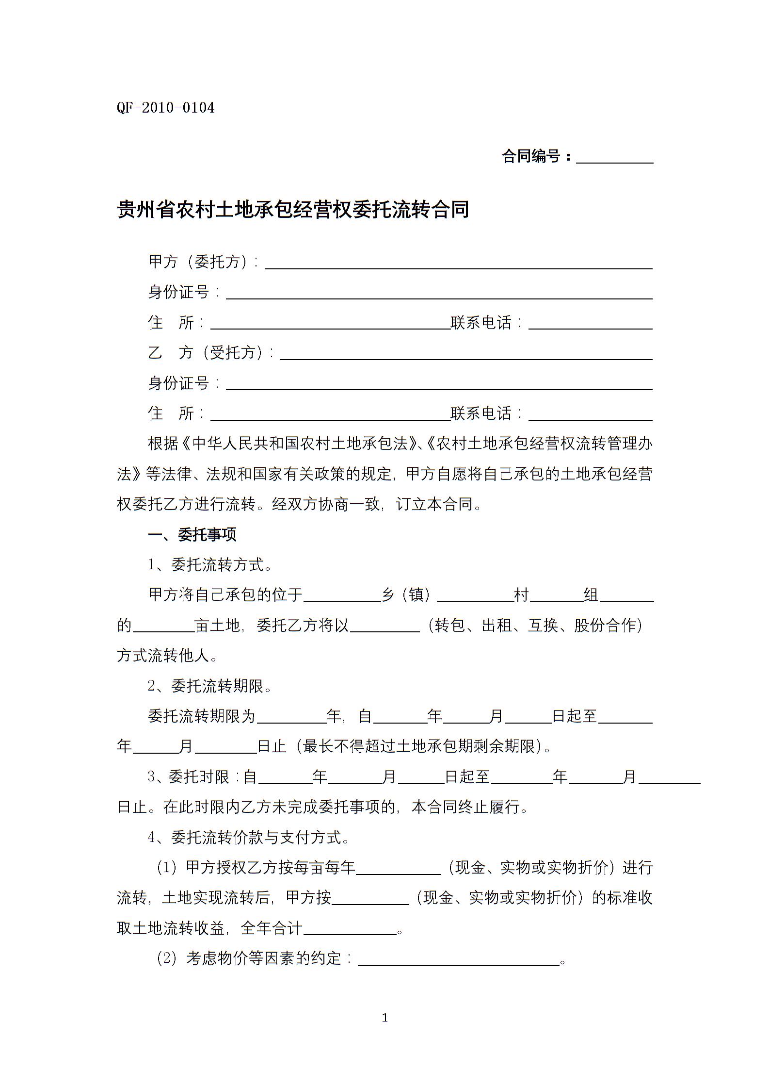 贵州省农村土地承包经营权委托流转合同