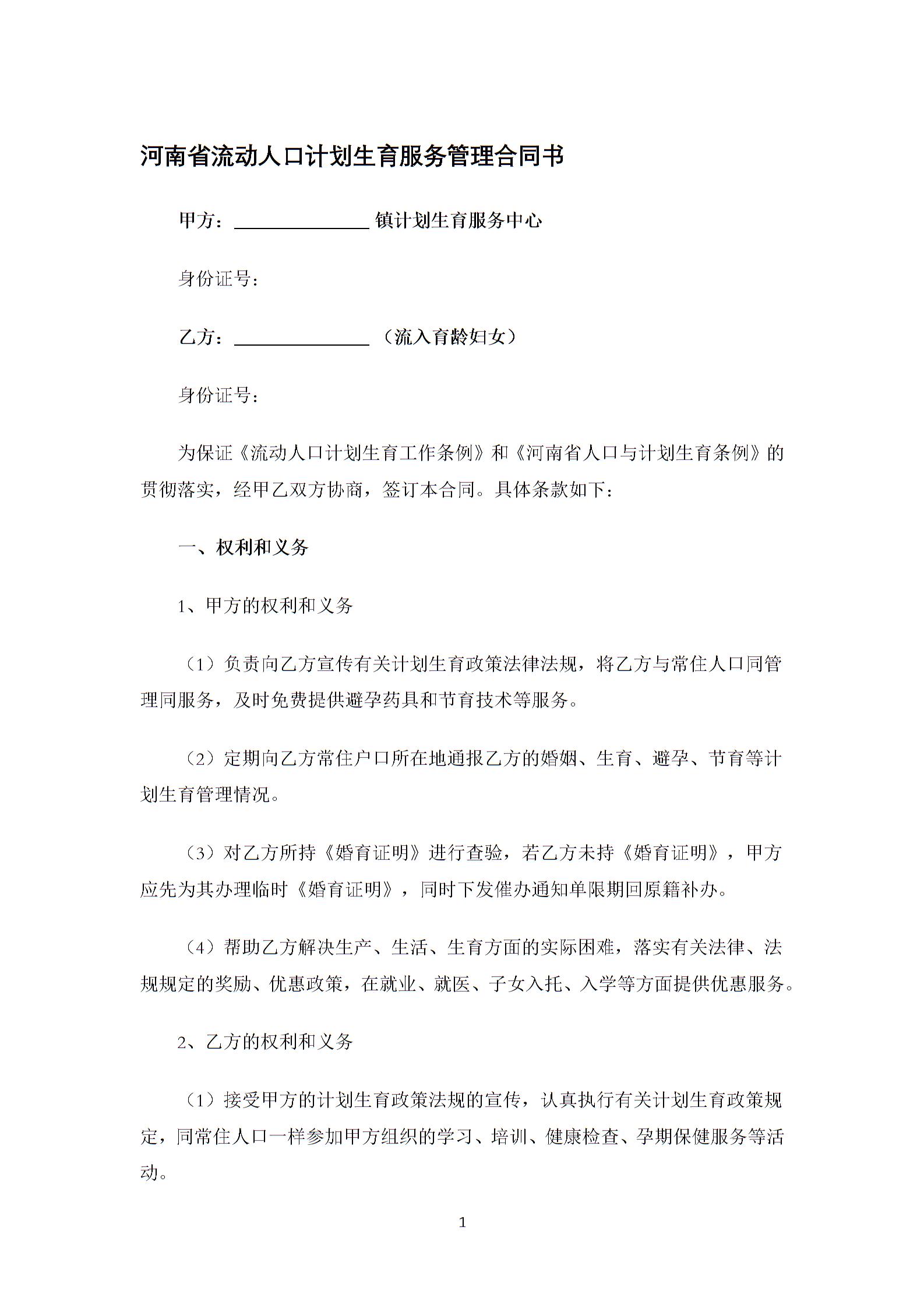 河南省流动人口计划生育服务管理合同书