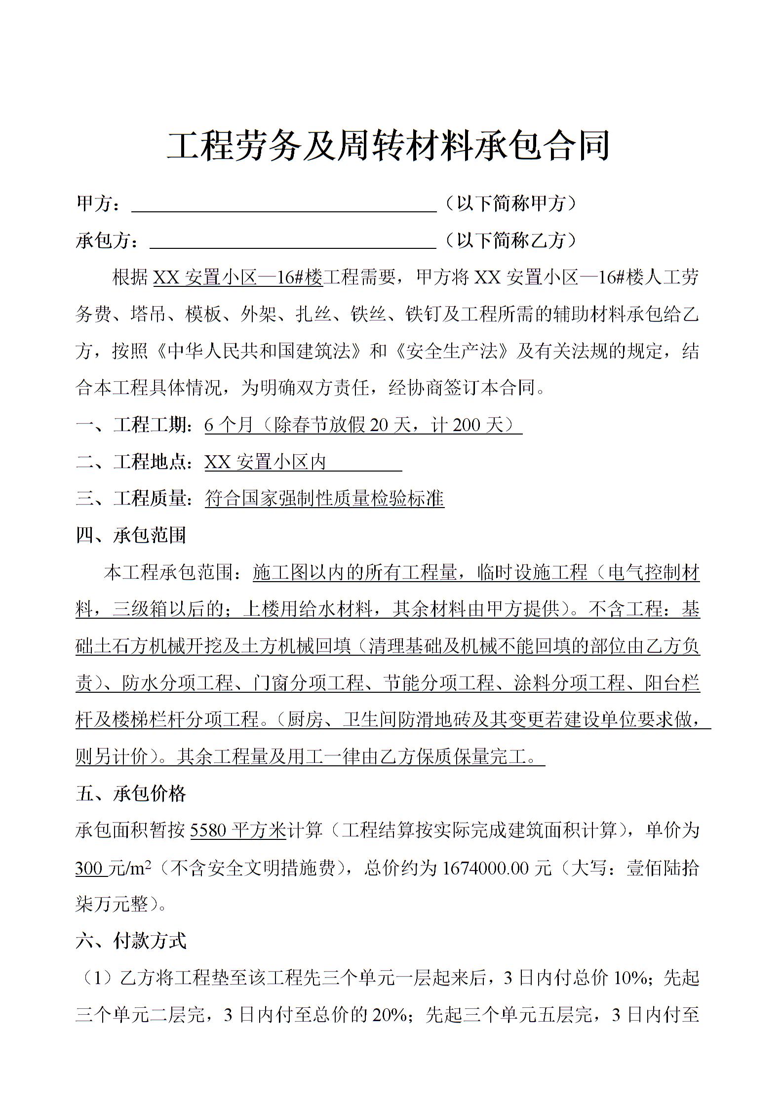 工程劳务及周转材料承包合同示范文本