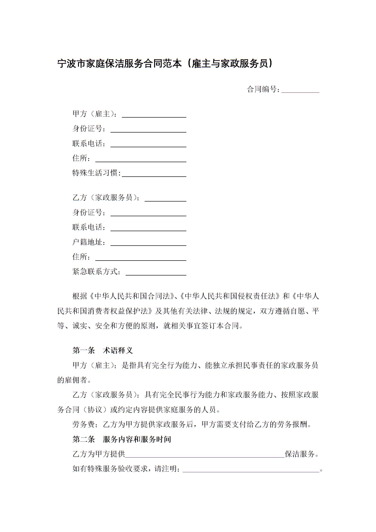 宁波市家庭保洁服务合同范本(雇主与家政服务员)