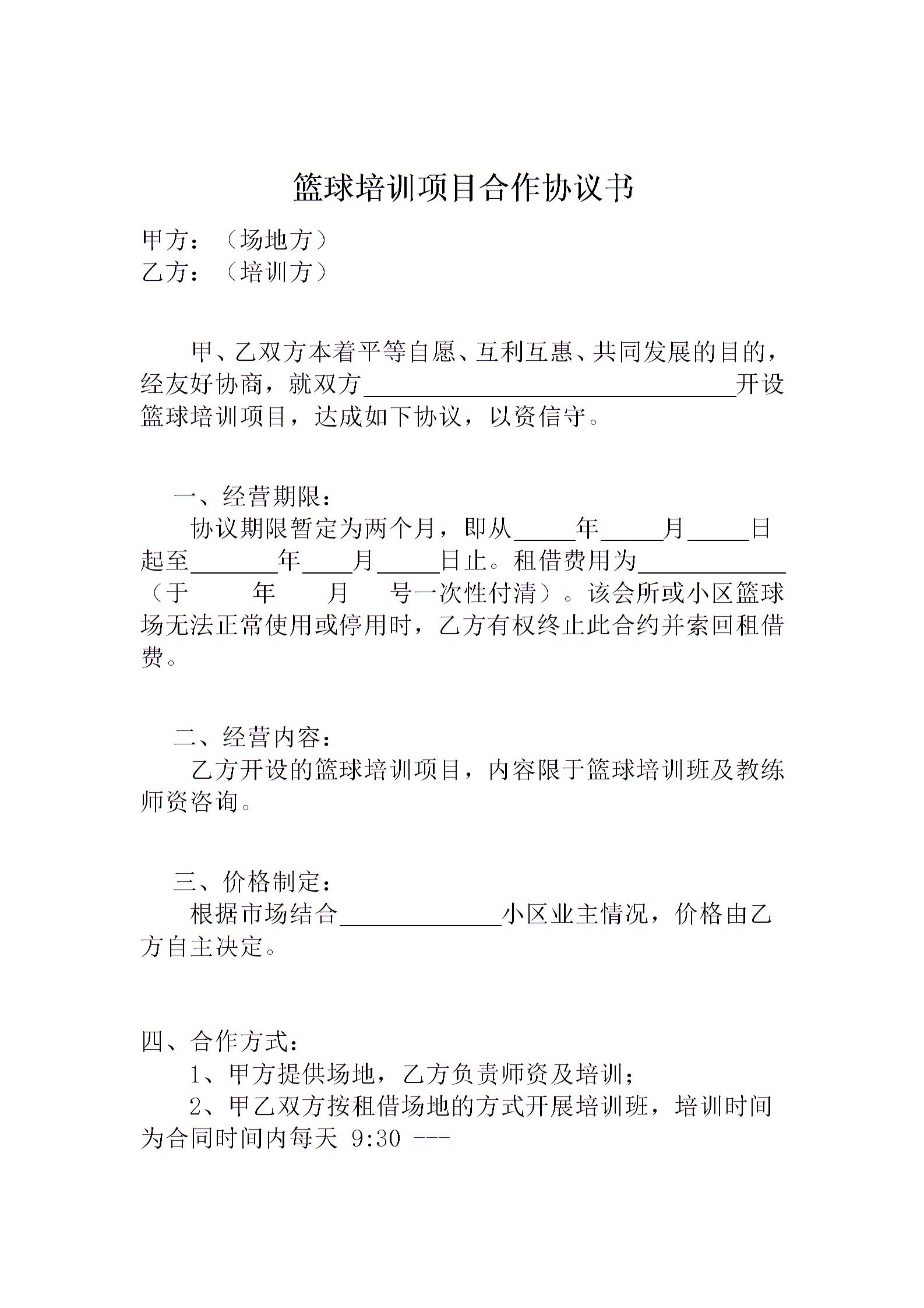 篮球培训项目合作协议书