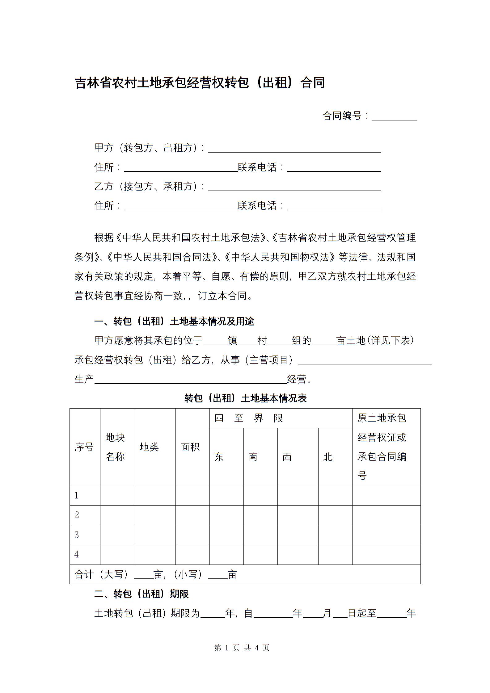 吉林省农村土地承包经营权转包(出租)合同