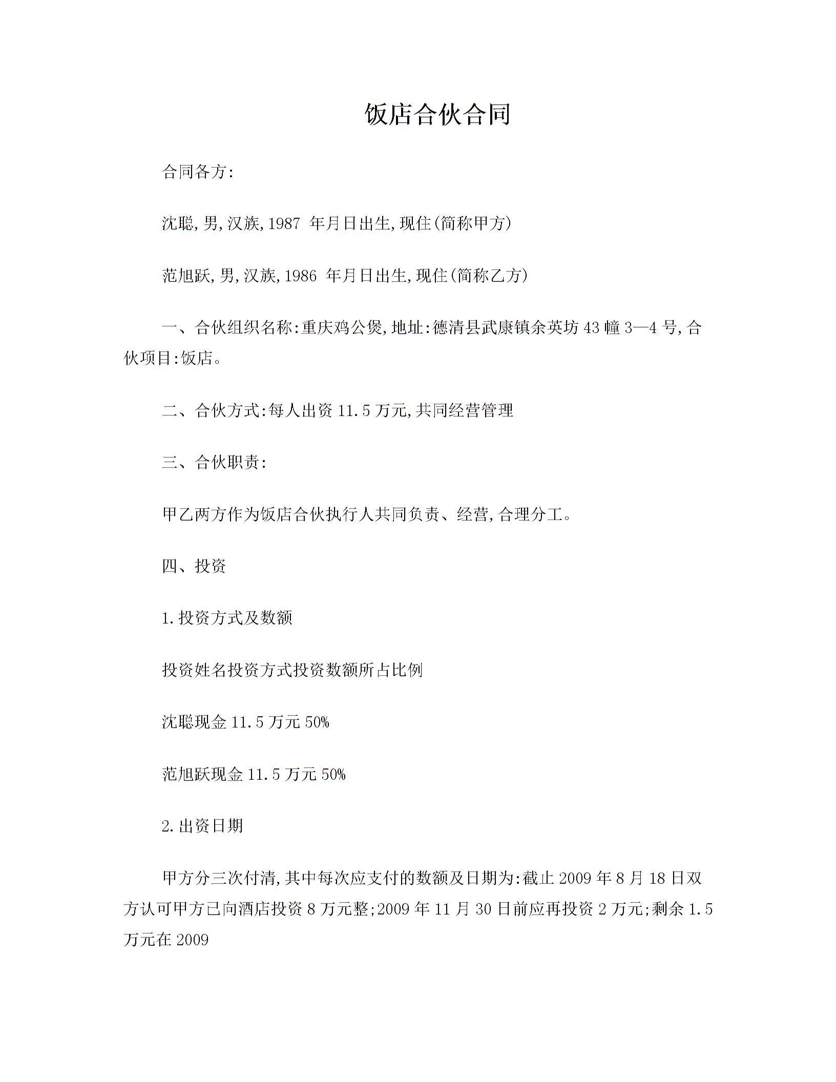 饭店合伙合同