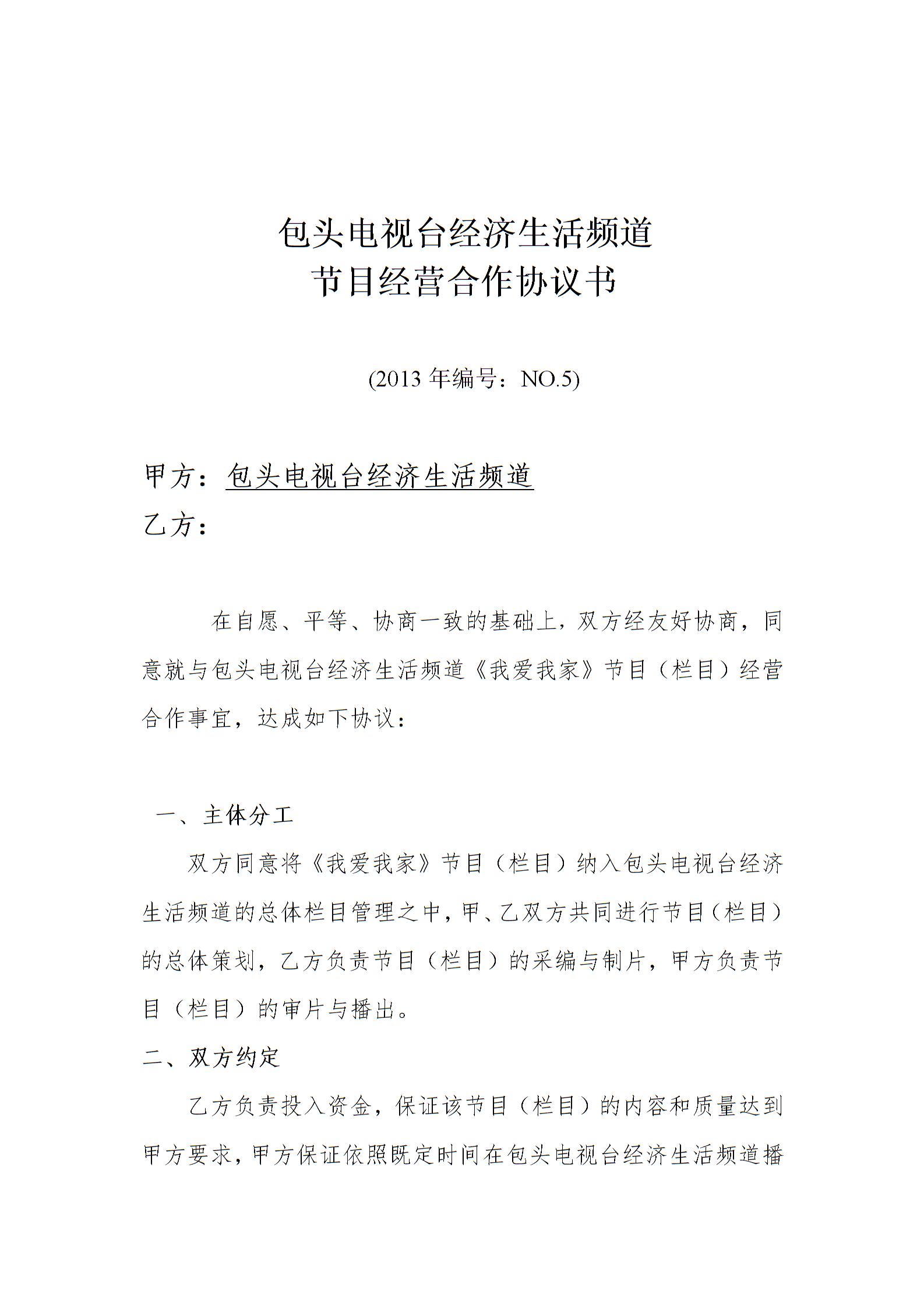 电视台节目合作协议书(我爱我家)