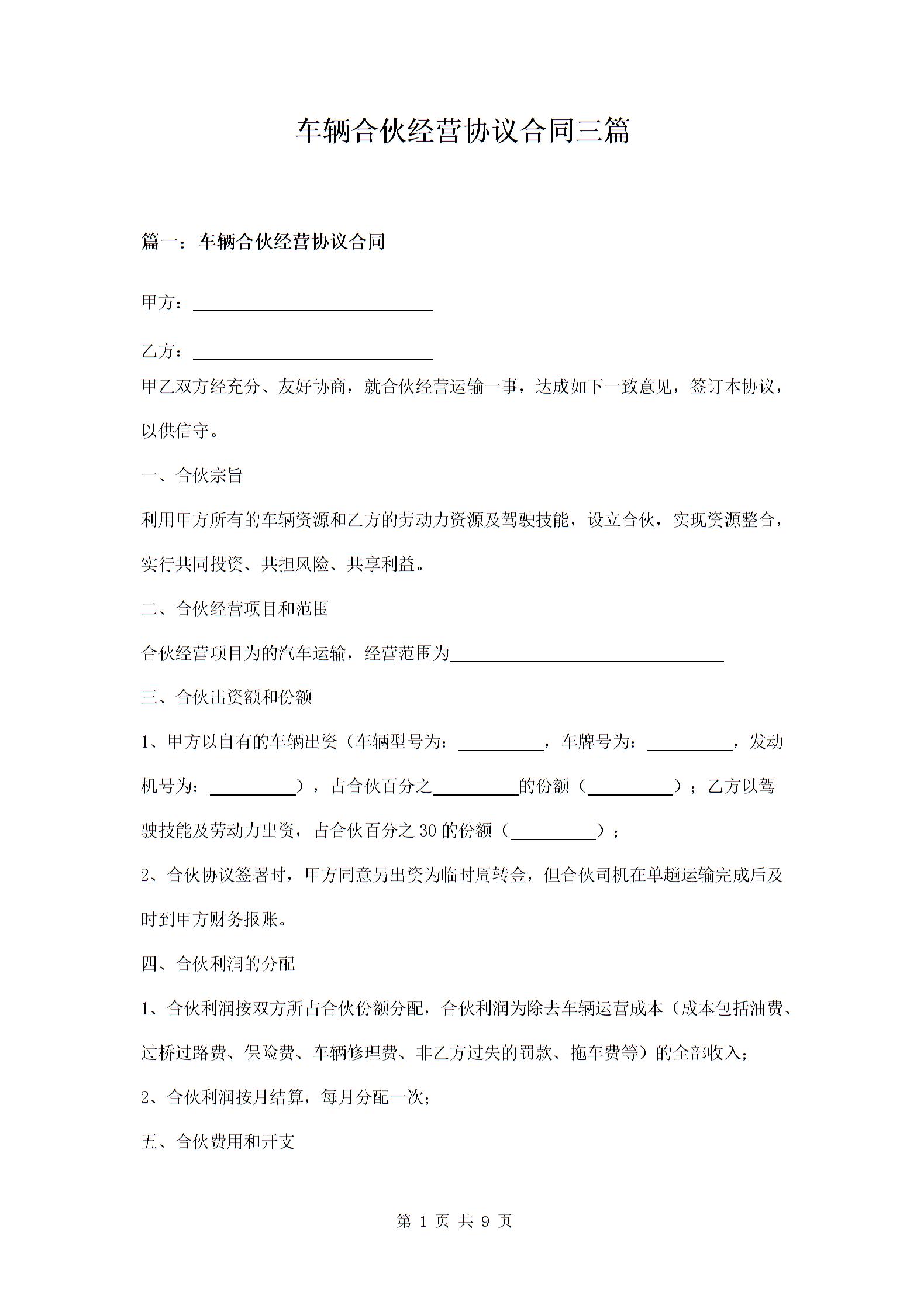 车辆合伙经营协议合同三篇
