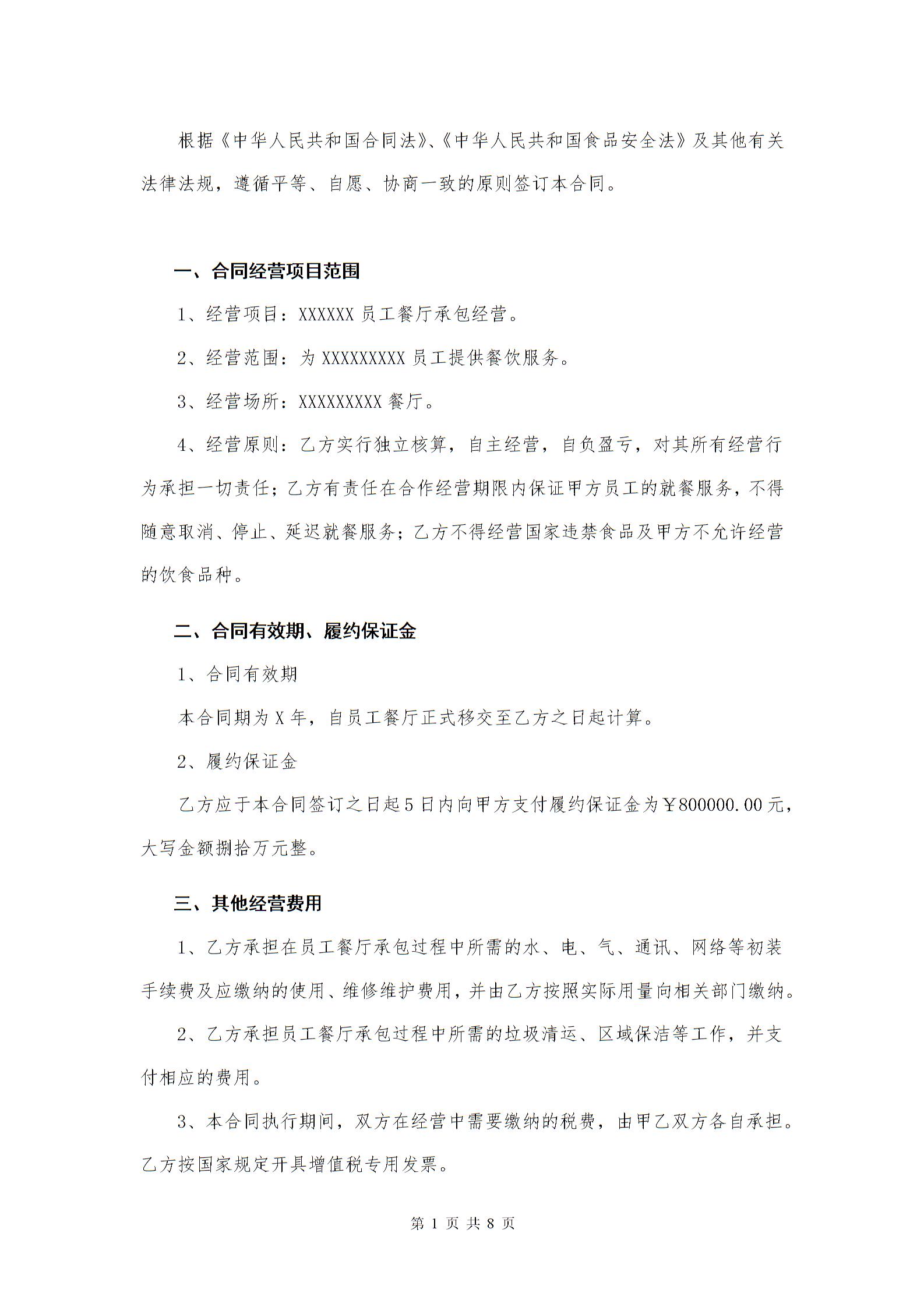 员工餐厅承包合同
