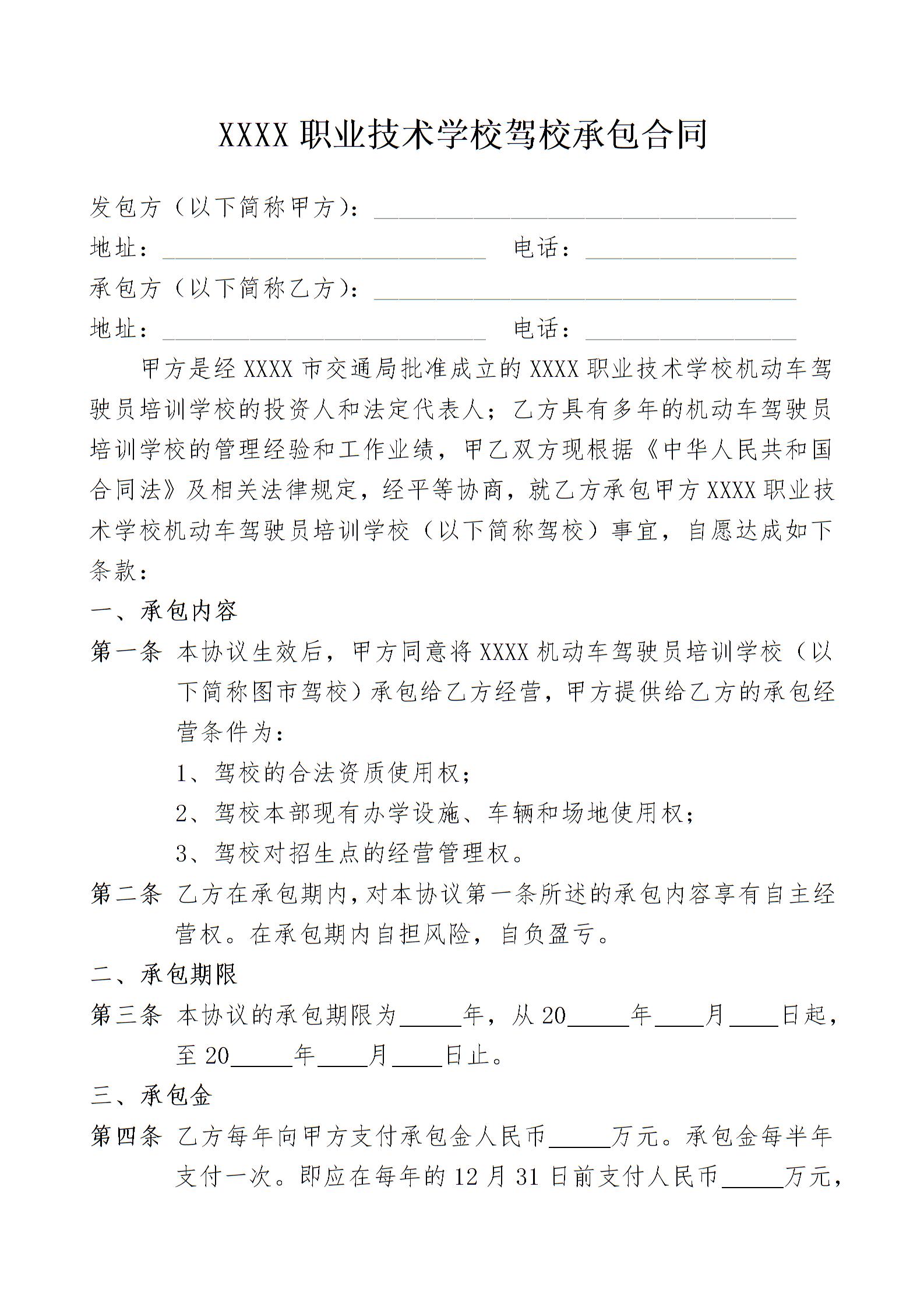 职业技术学校驾校承包合同律师拟定版本