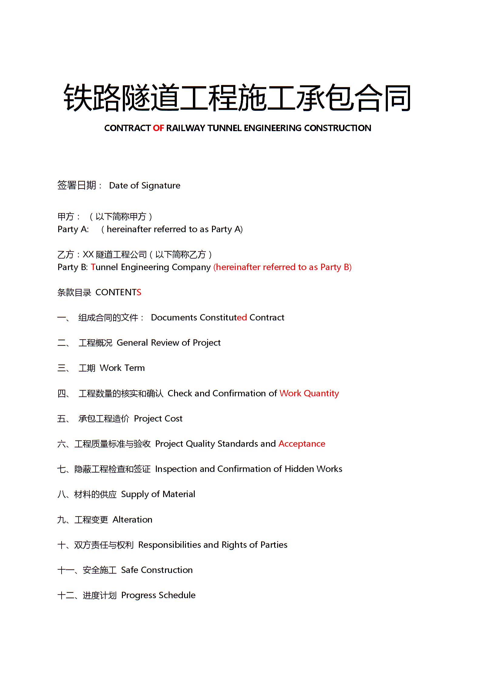 铁路隧道工程施工承包合同中英文版示范文本