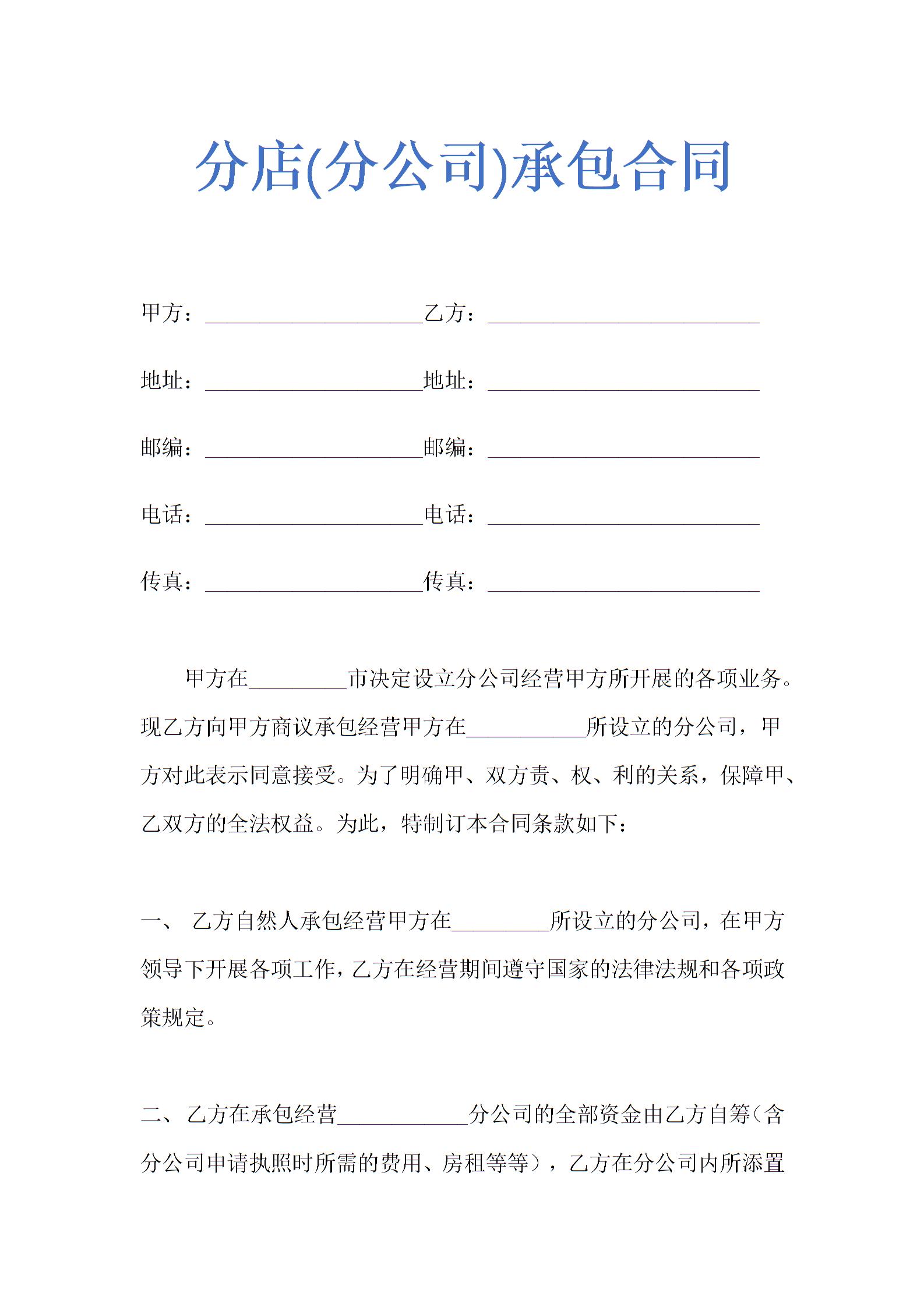 分店(分公司)承包合同示范文本