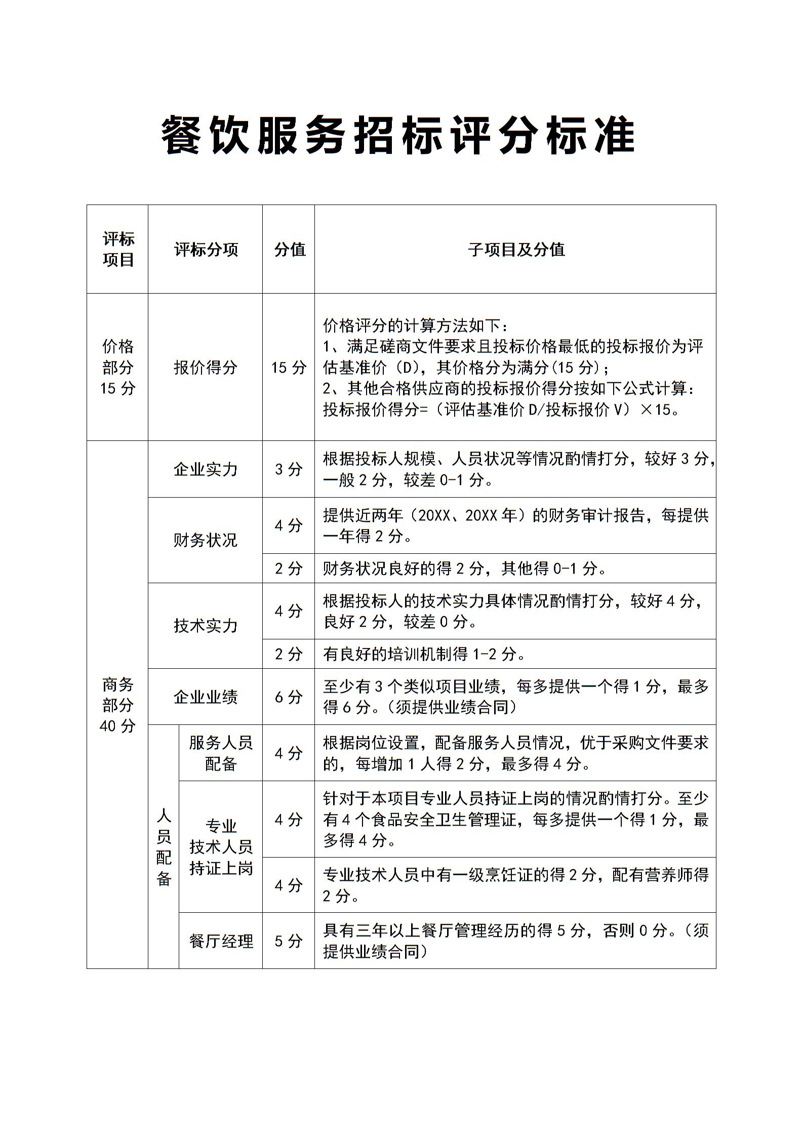 餐饮服务招标评分标准