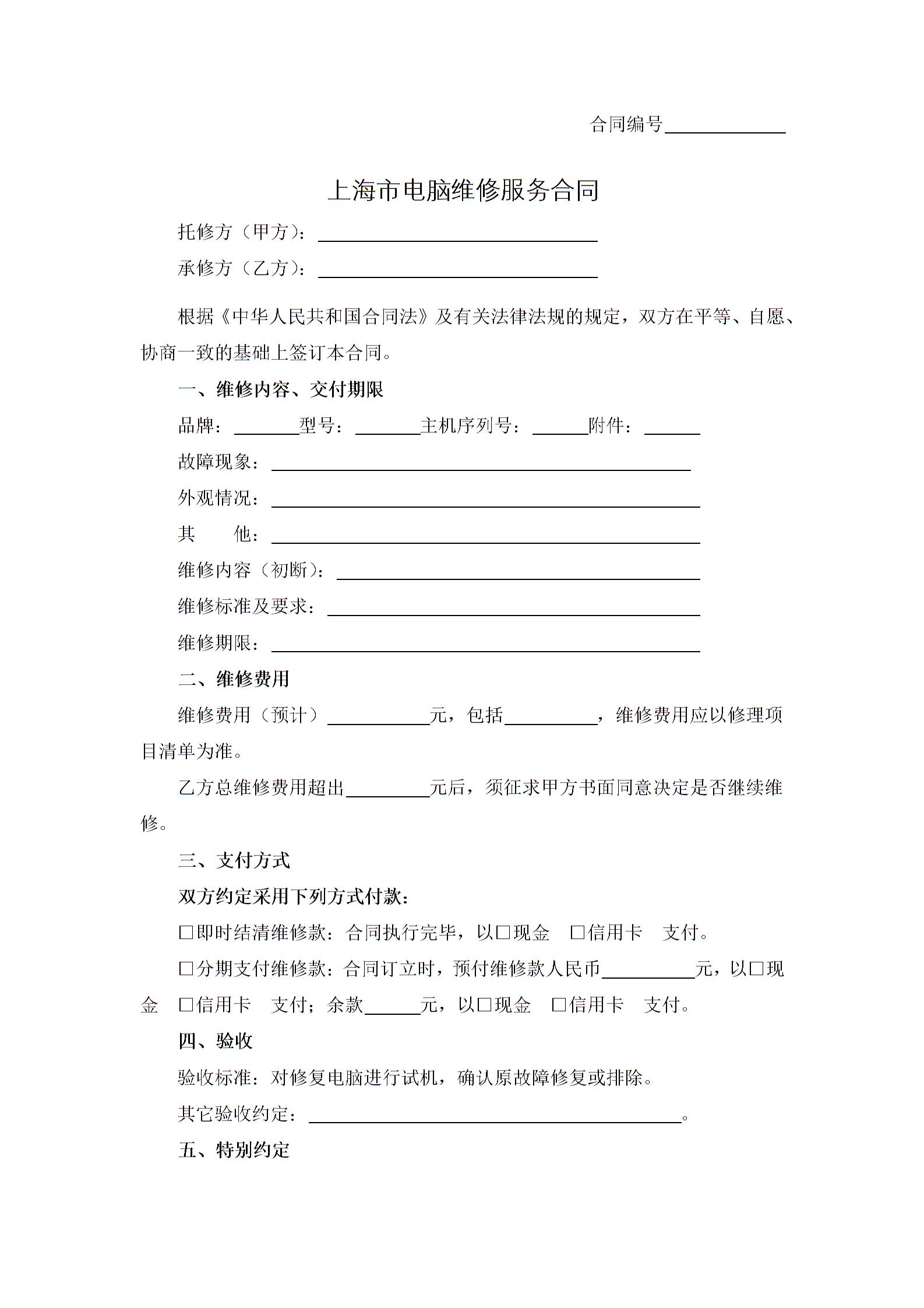 上海市电脑维修服务合同