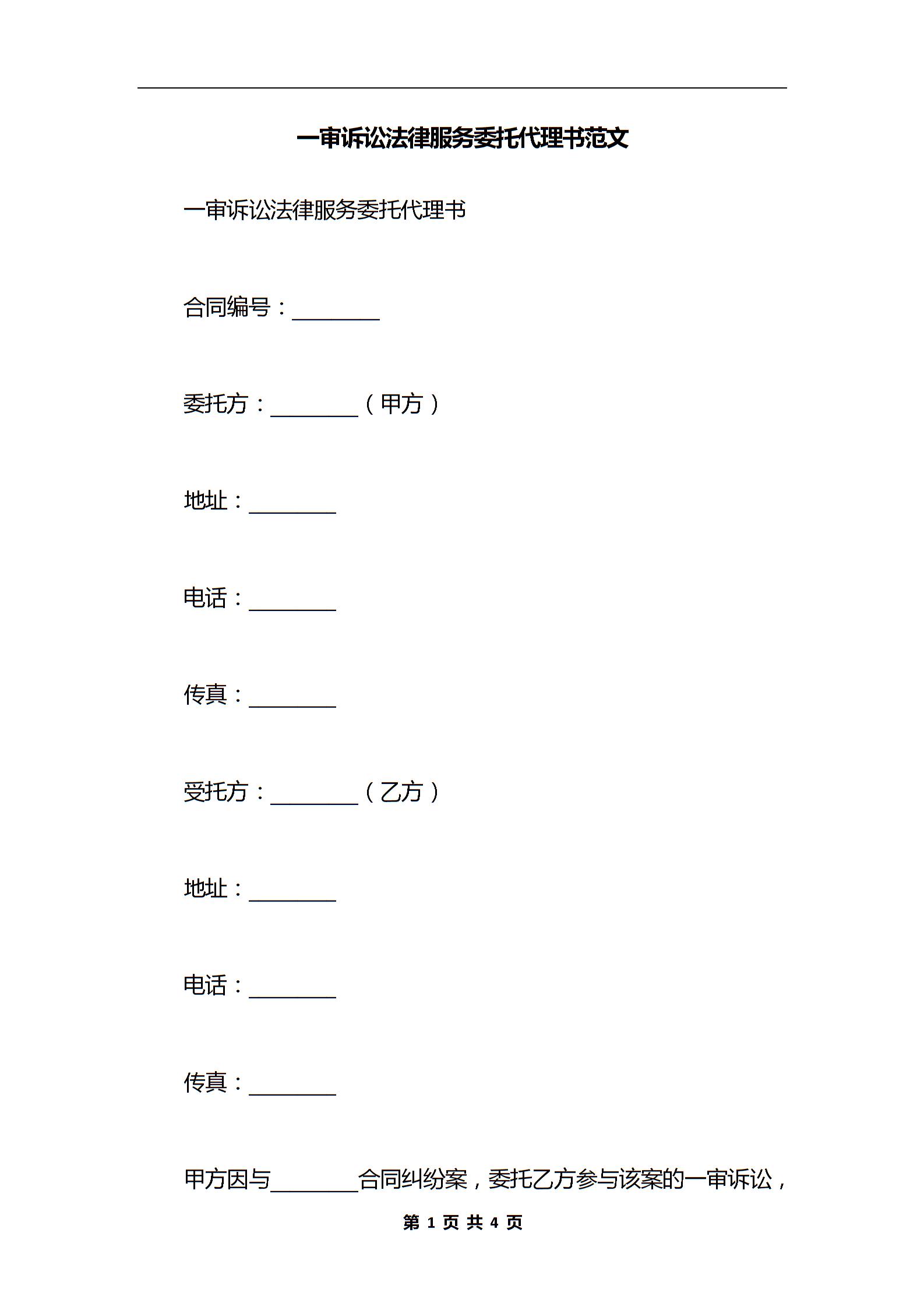 一审诉讼法律服务委托代理书范文