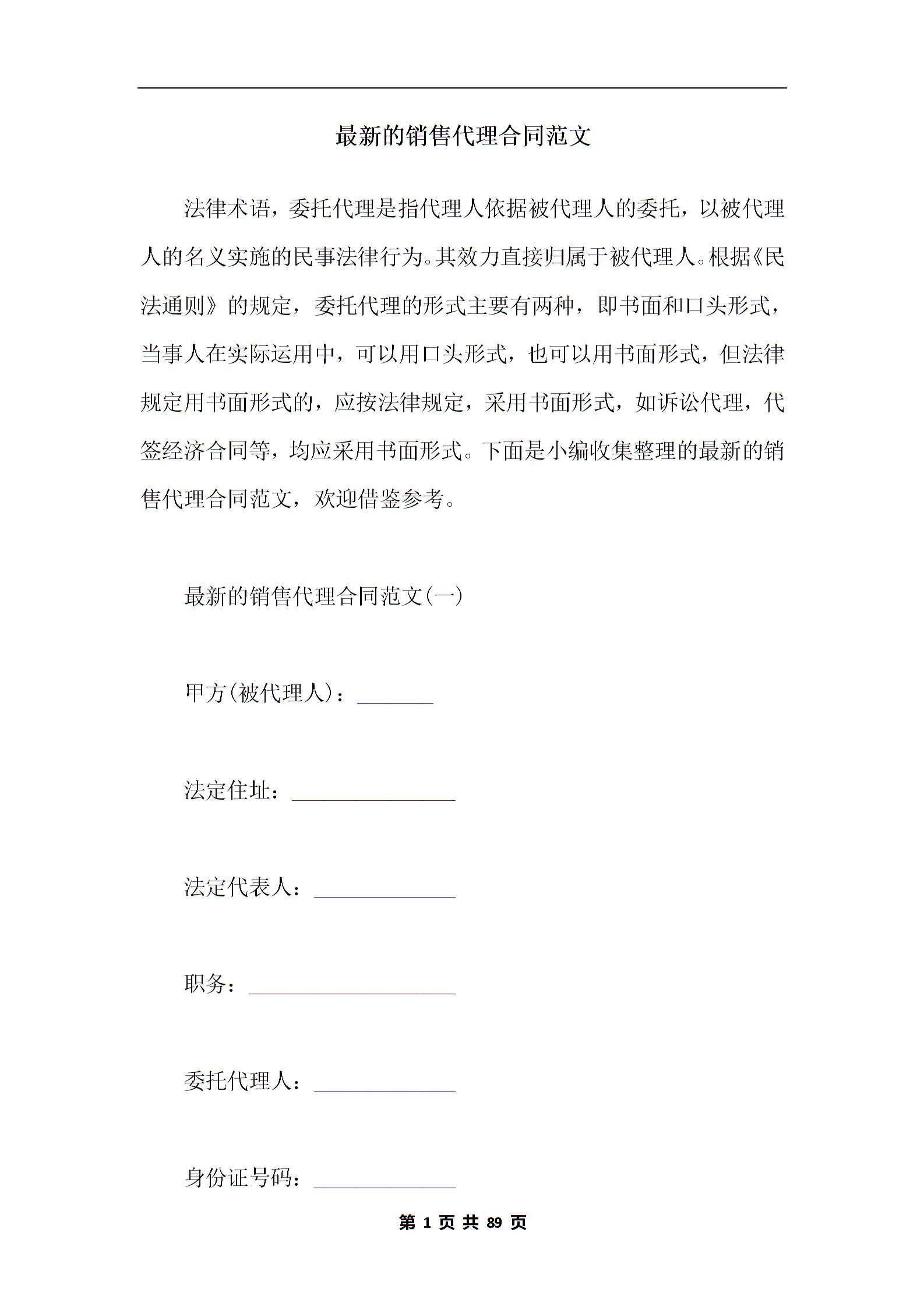 最新的销售代理合同范文