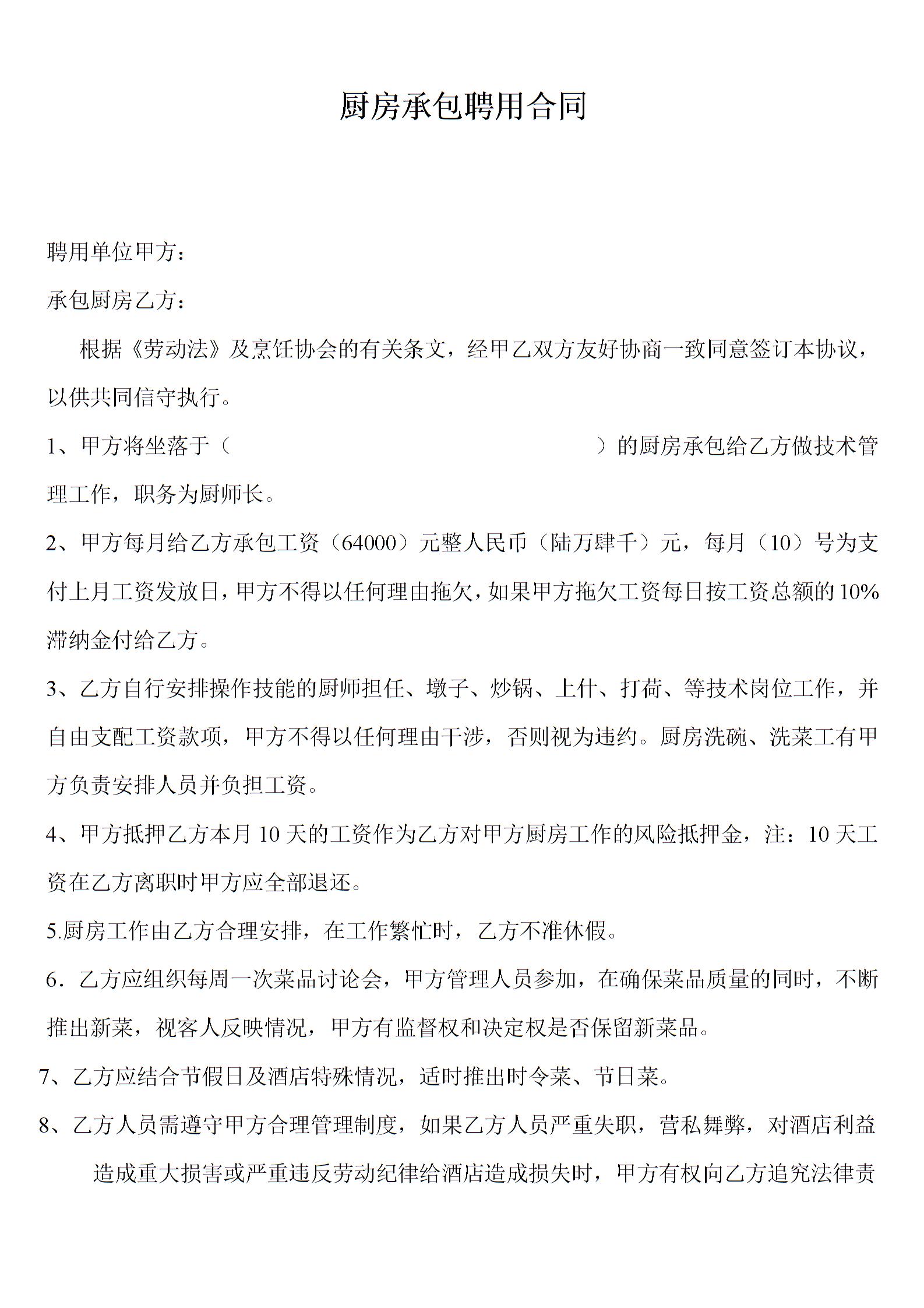 厨房承包聘用合同