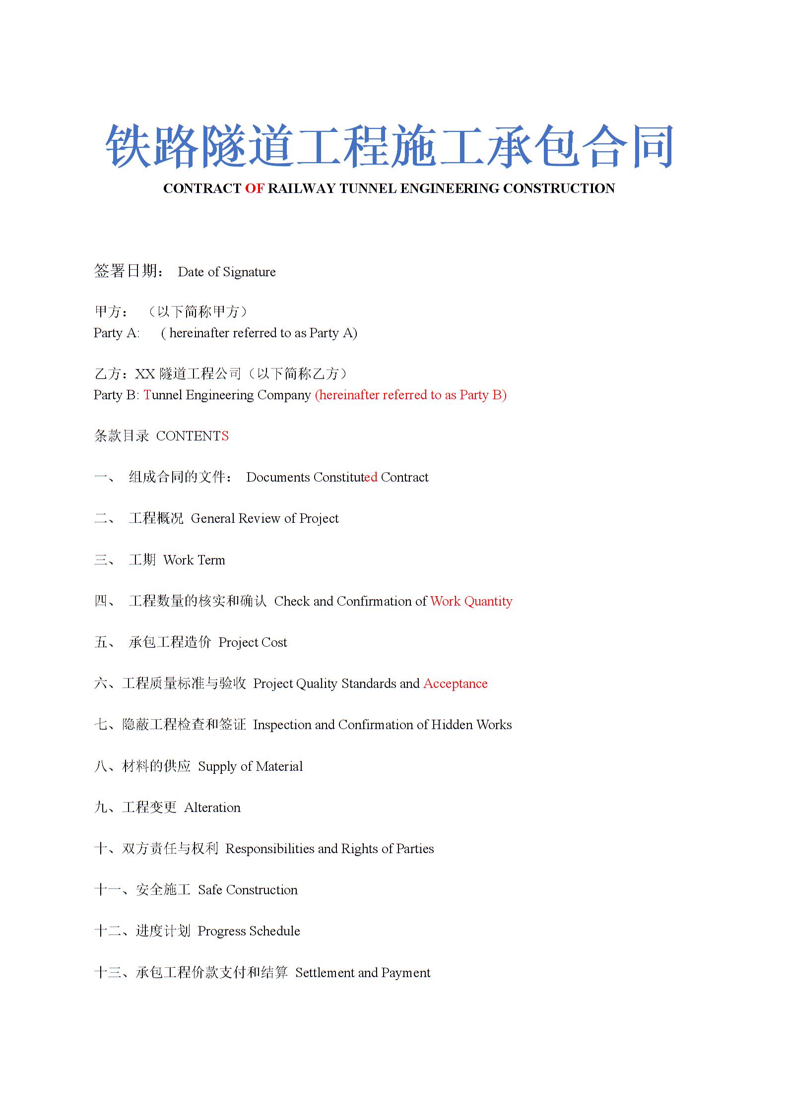 铁路隧道工程施工承包合同中英文版示范文本