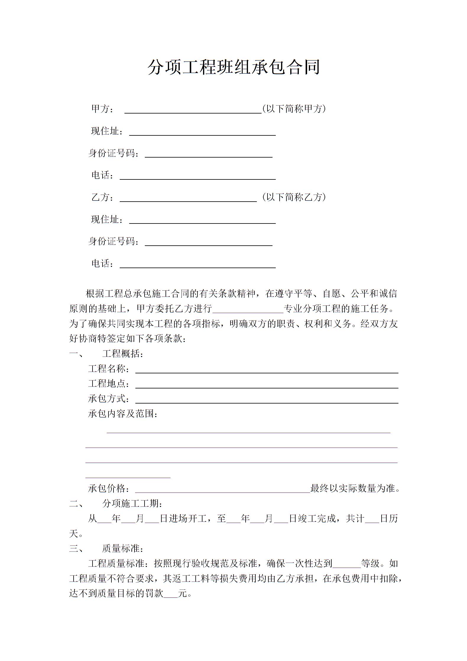 分项工程班组承包合同