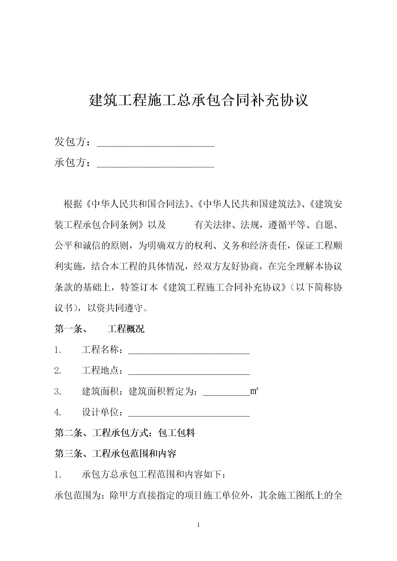建筑工程施工总承包合同补充协议