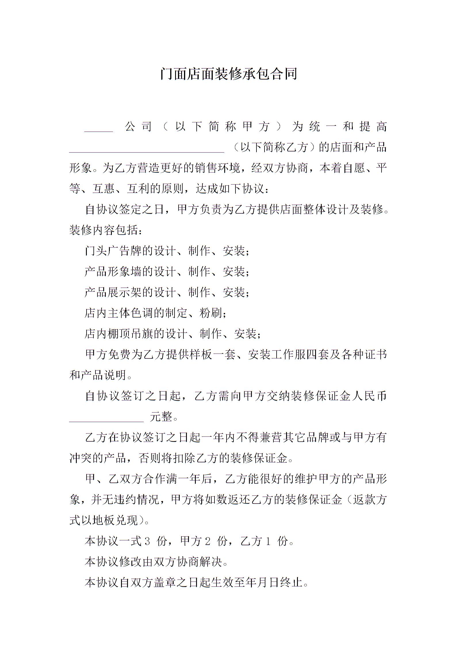 门面店面装修承包合同