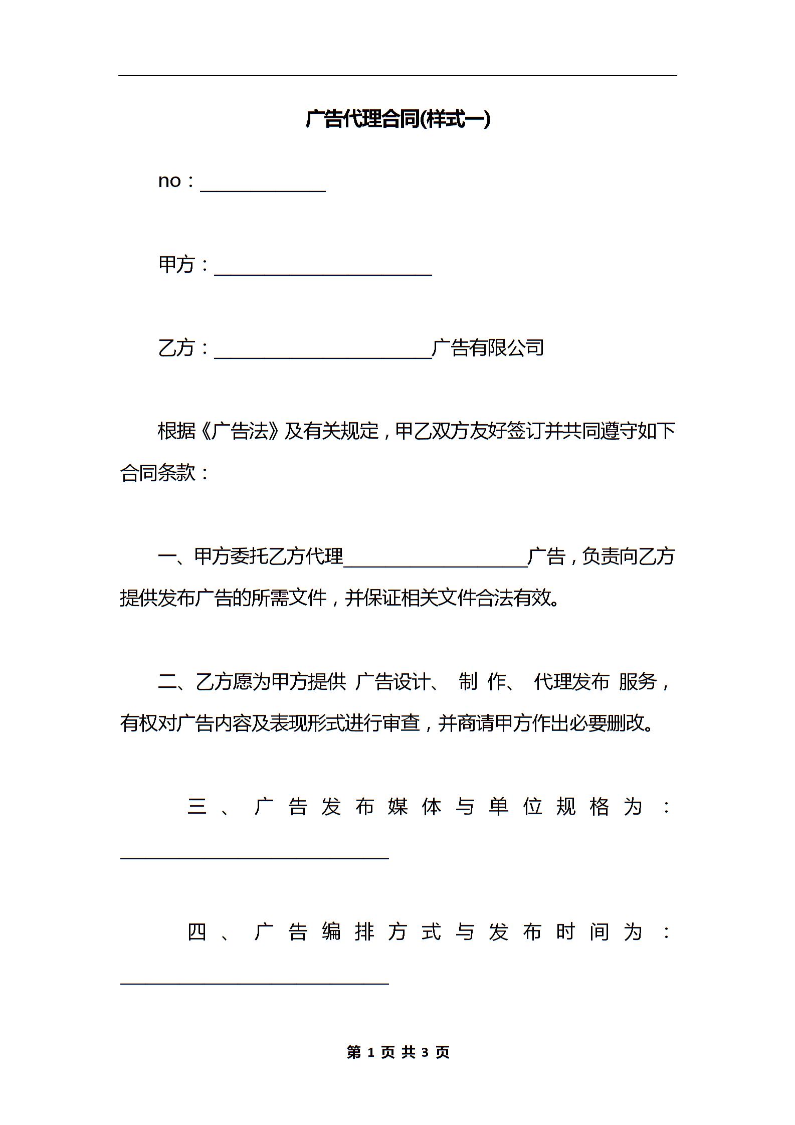 广告代理合同(样式一)
