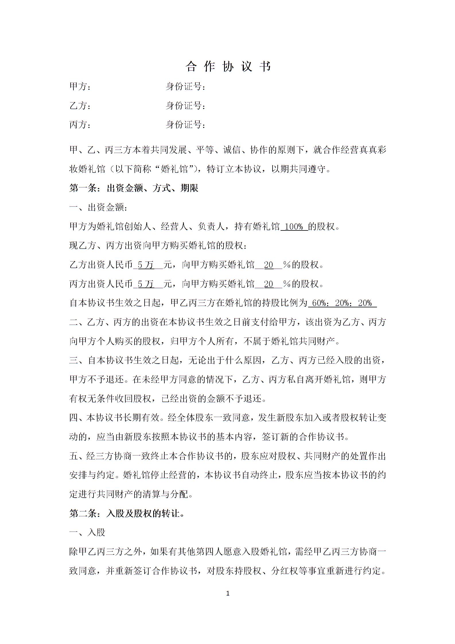 婚纱店 合作协议书