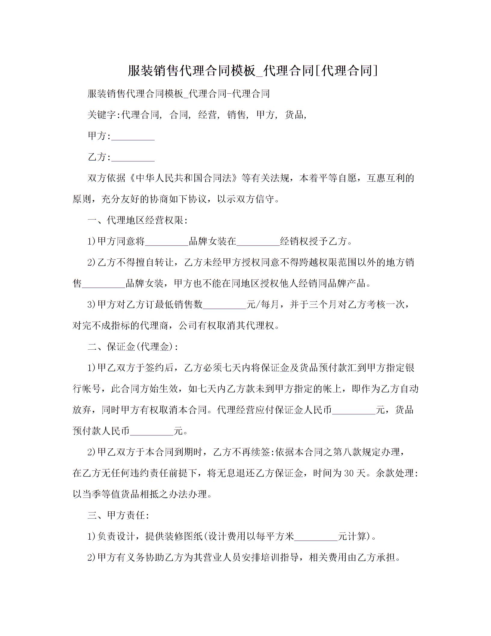 服装销售代理合同模板_代理合同[代理合同]