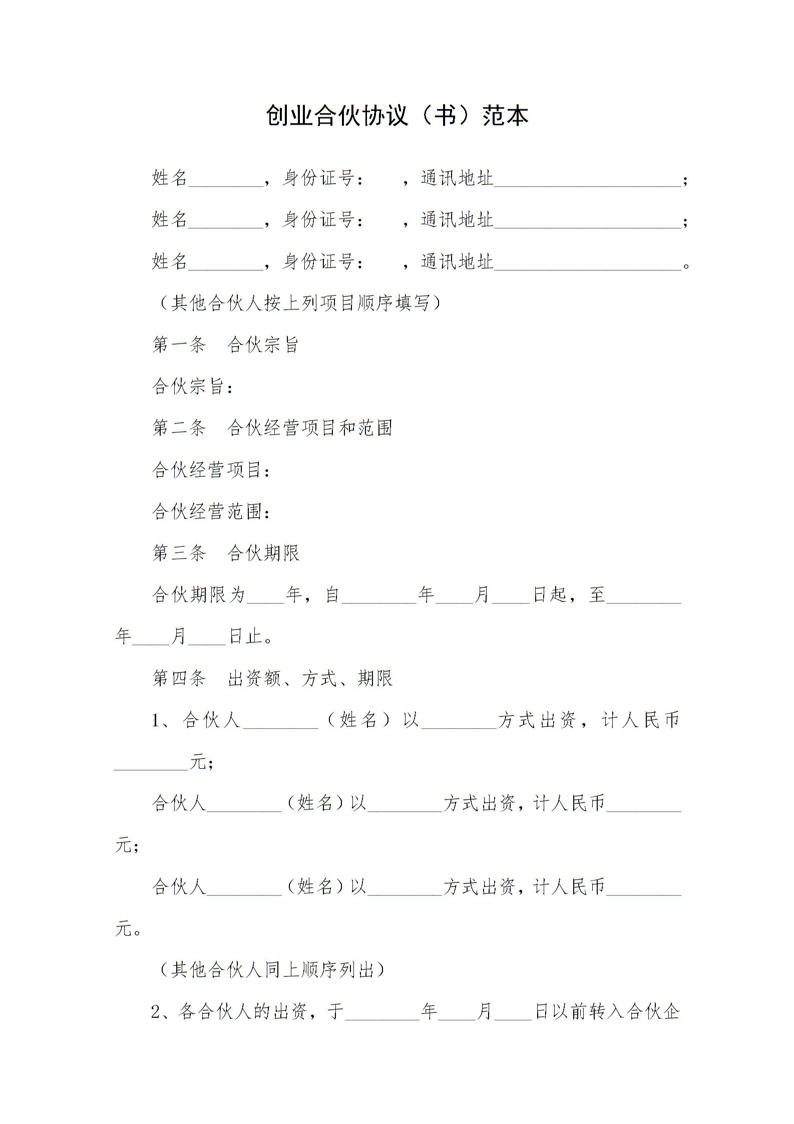 创业合伙协议书范本