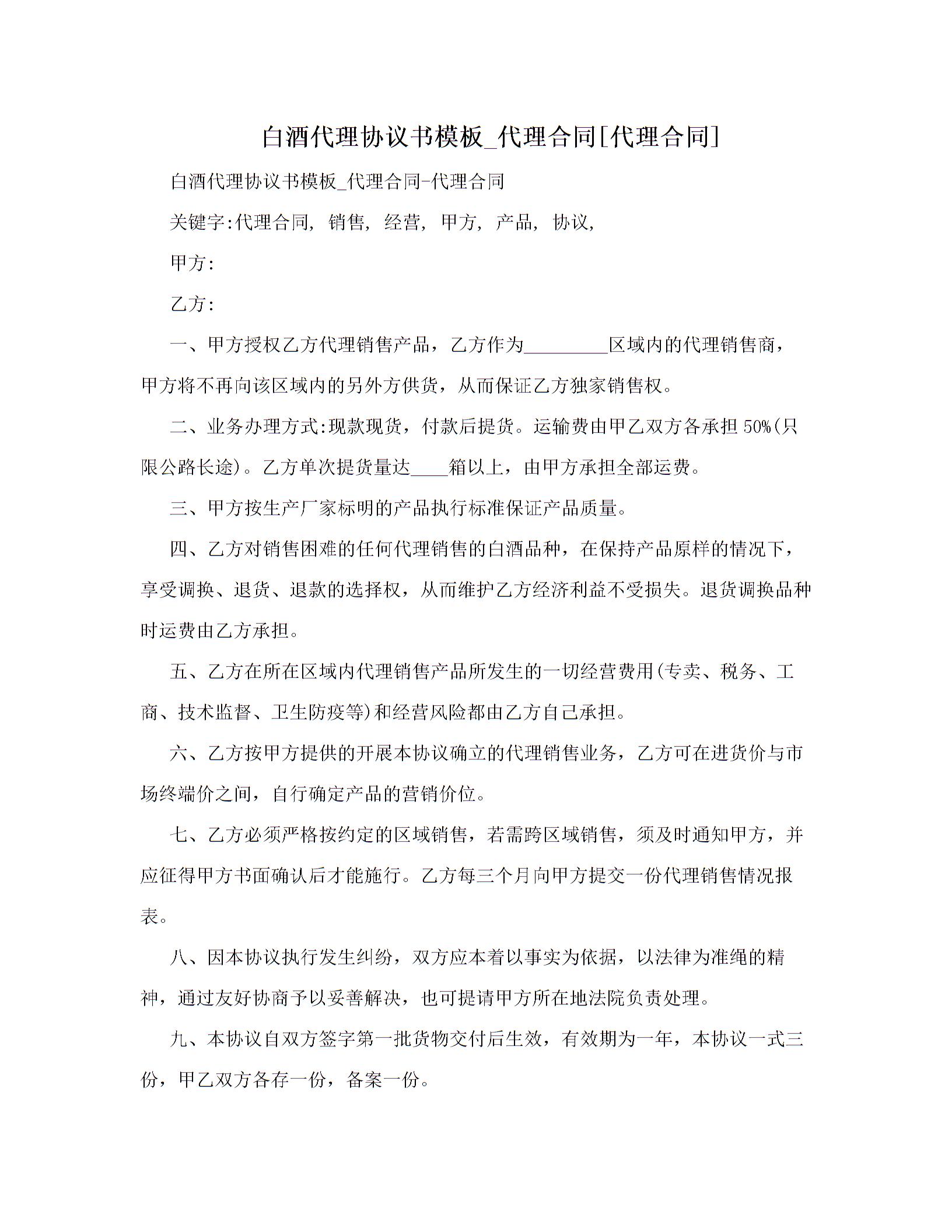 白酒代理协议书模板_代理合同[代理合同]