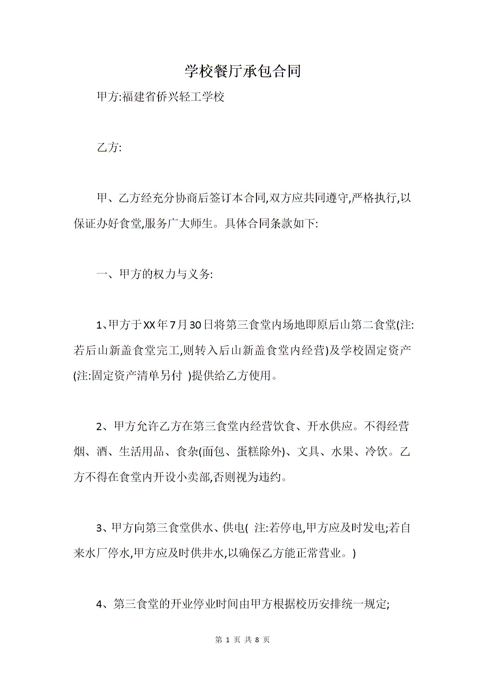 学校餐厅承包合同