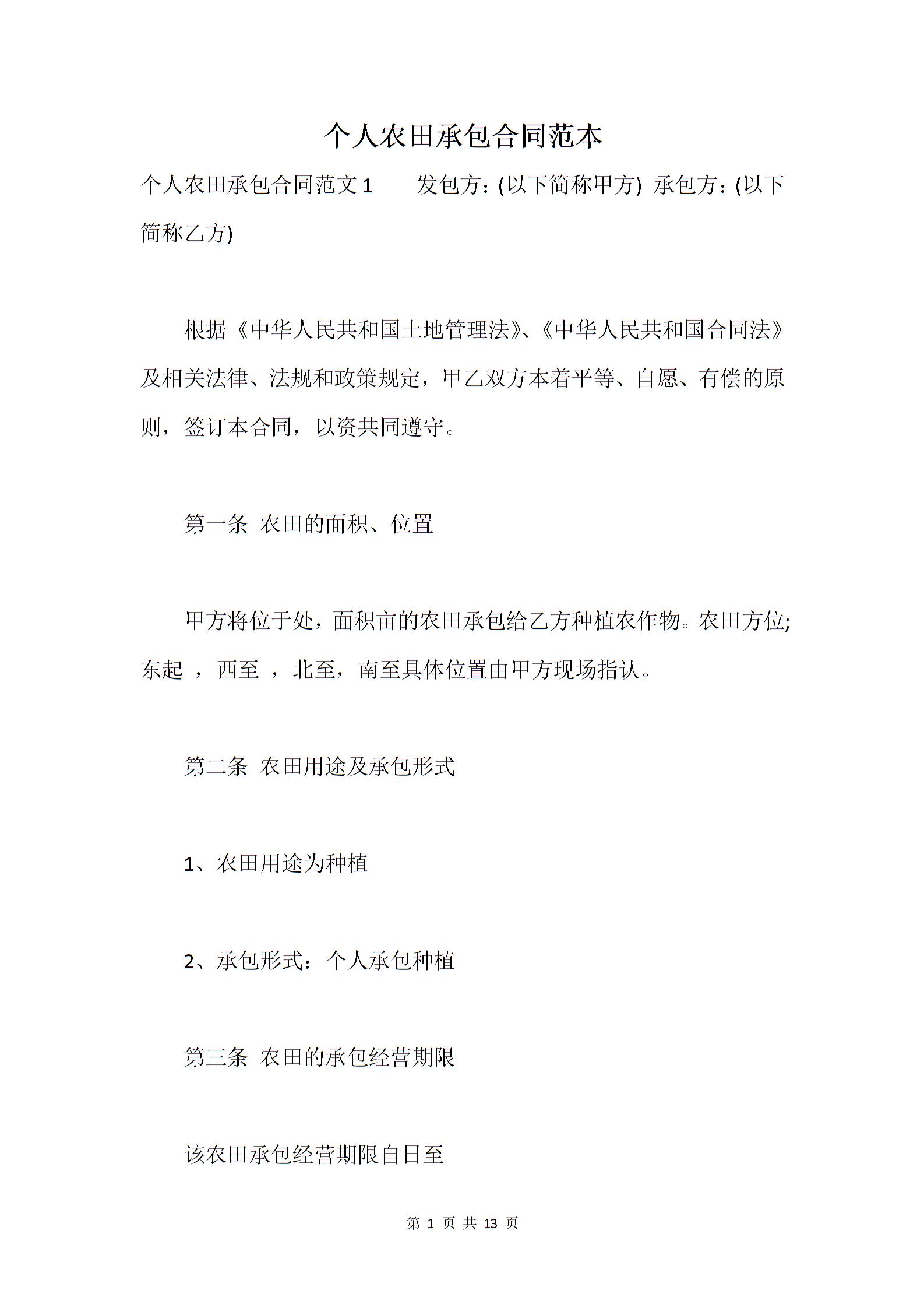 个人农田承包合同范本