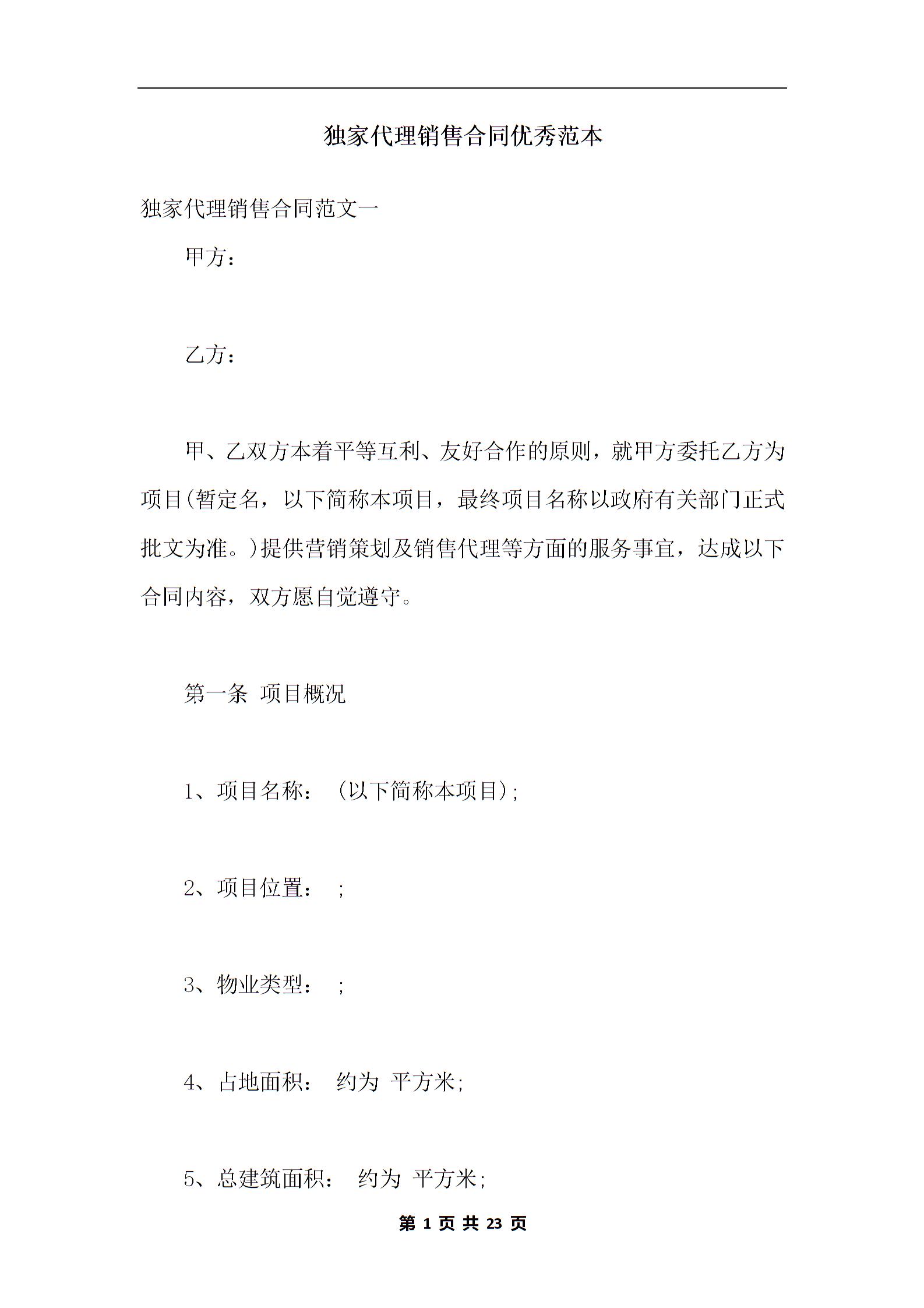 独家代理销售合同优秀范本