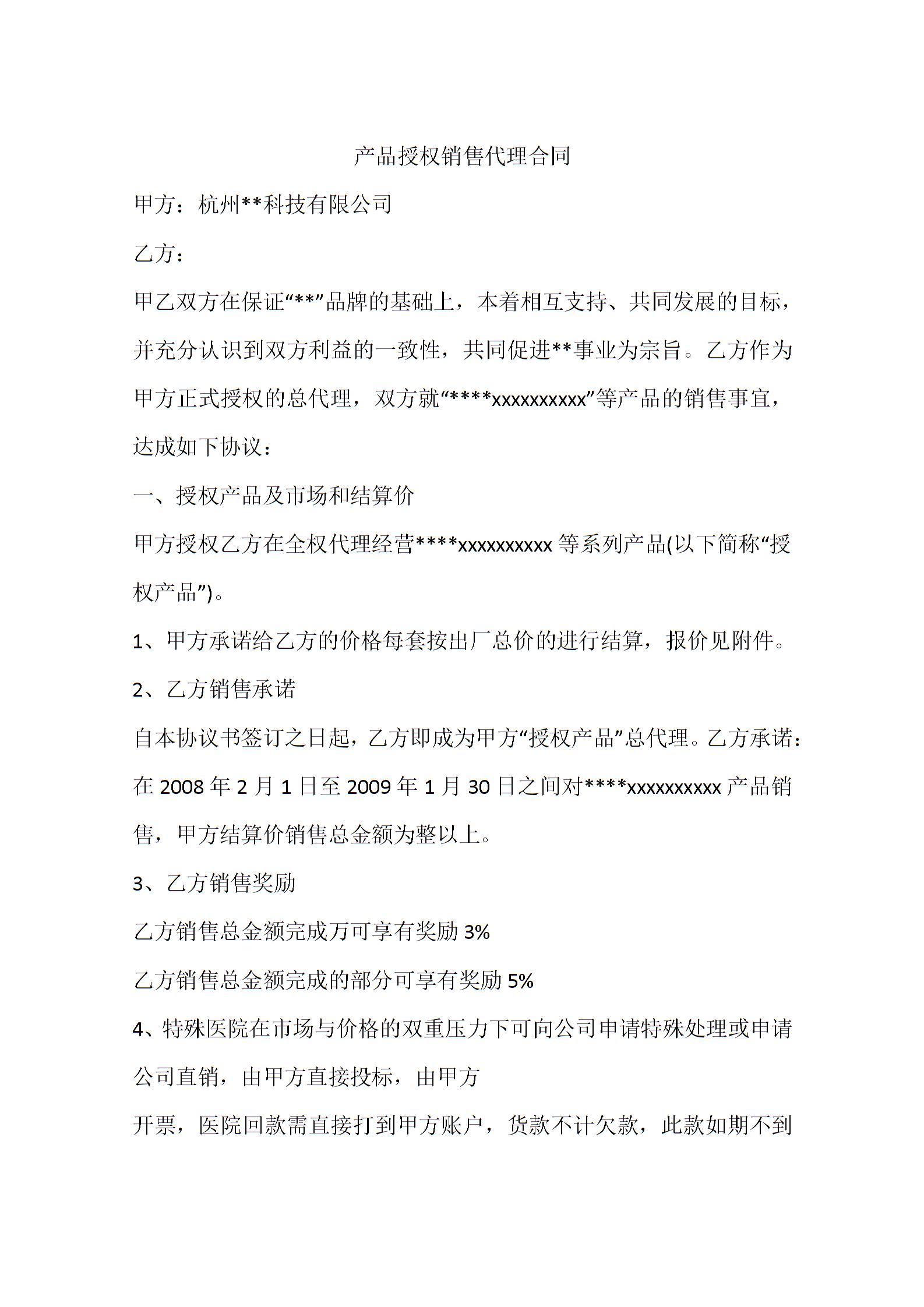 产品授权销售代理合同