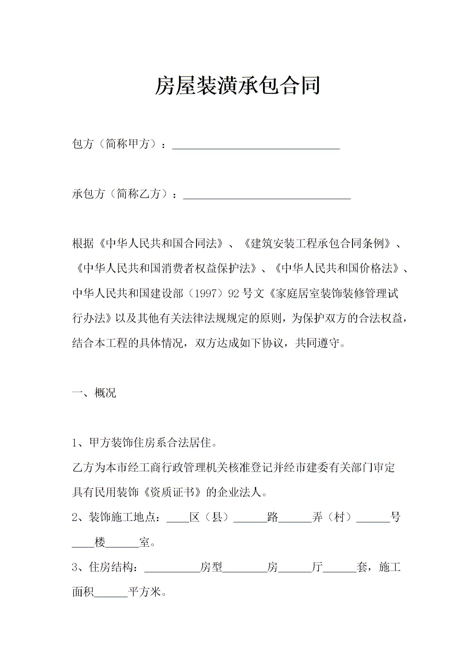 房屋装潢承包合同通用模板