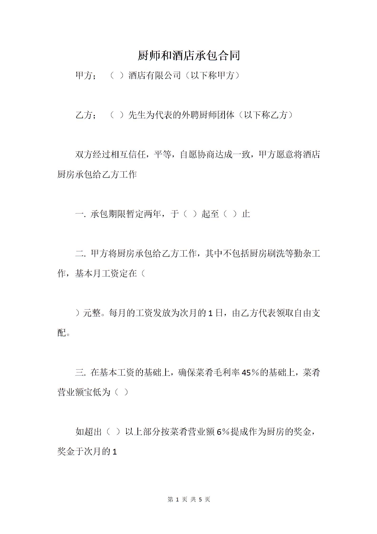 厨师和酒店承包合同