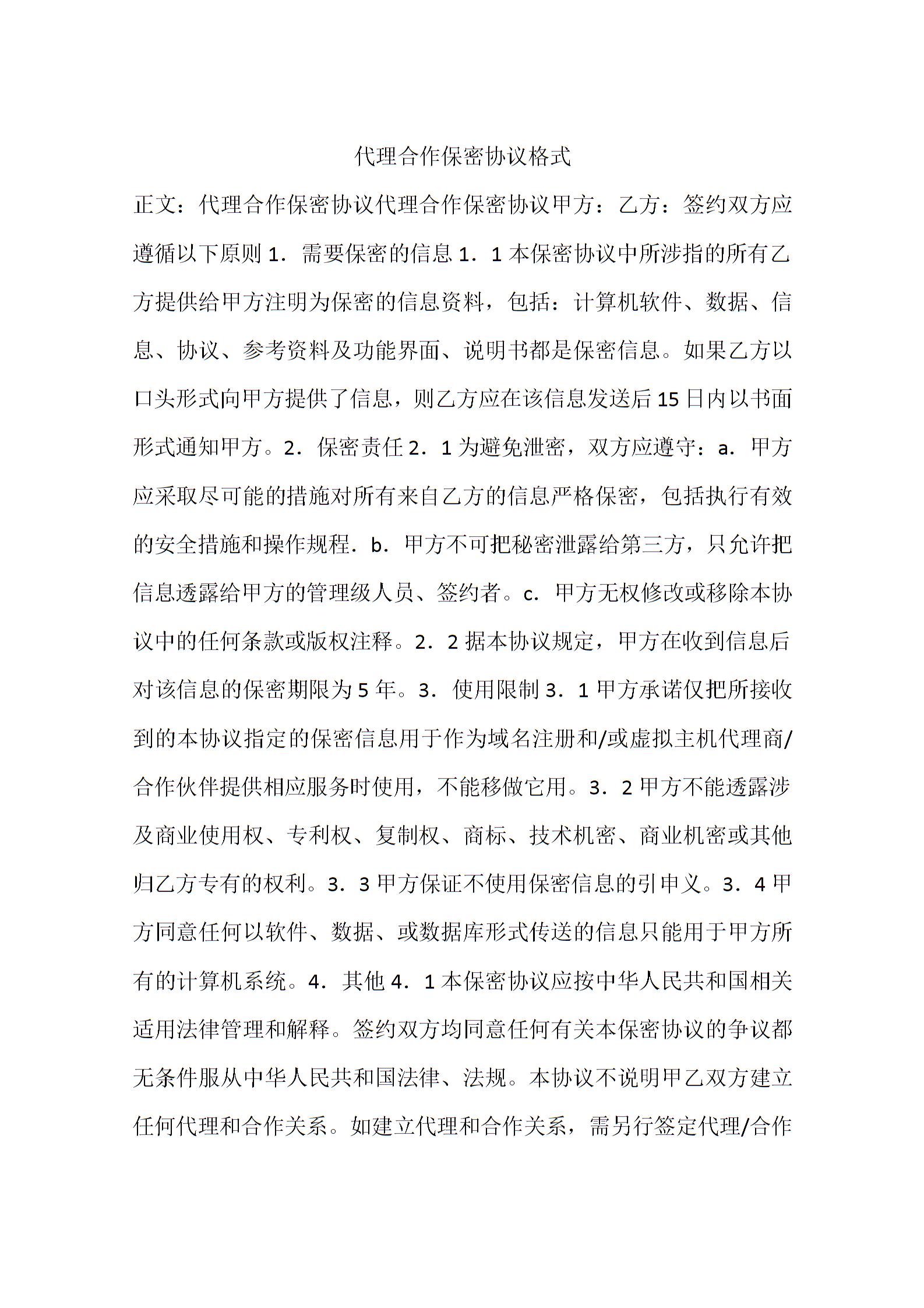 代理合作保密协议格式