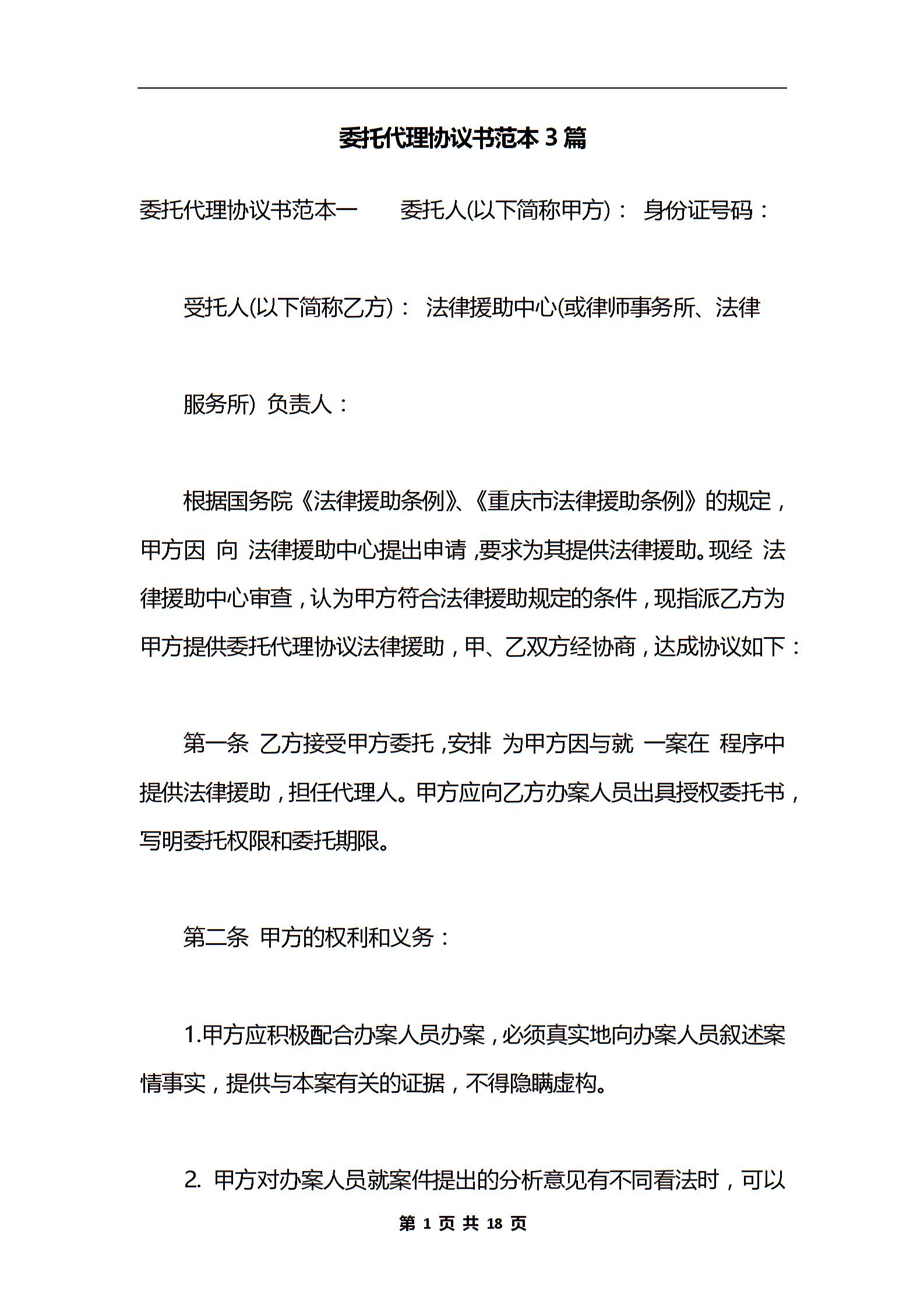委托代理协议书范本3篇