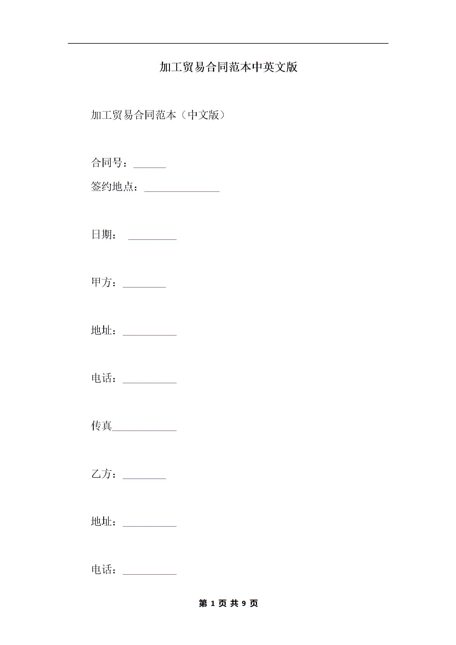 加工贸易合同范本中英文版