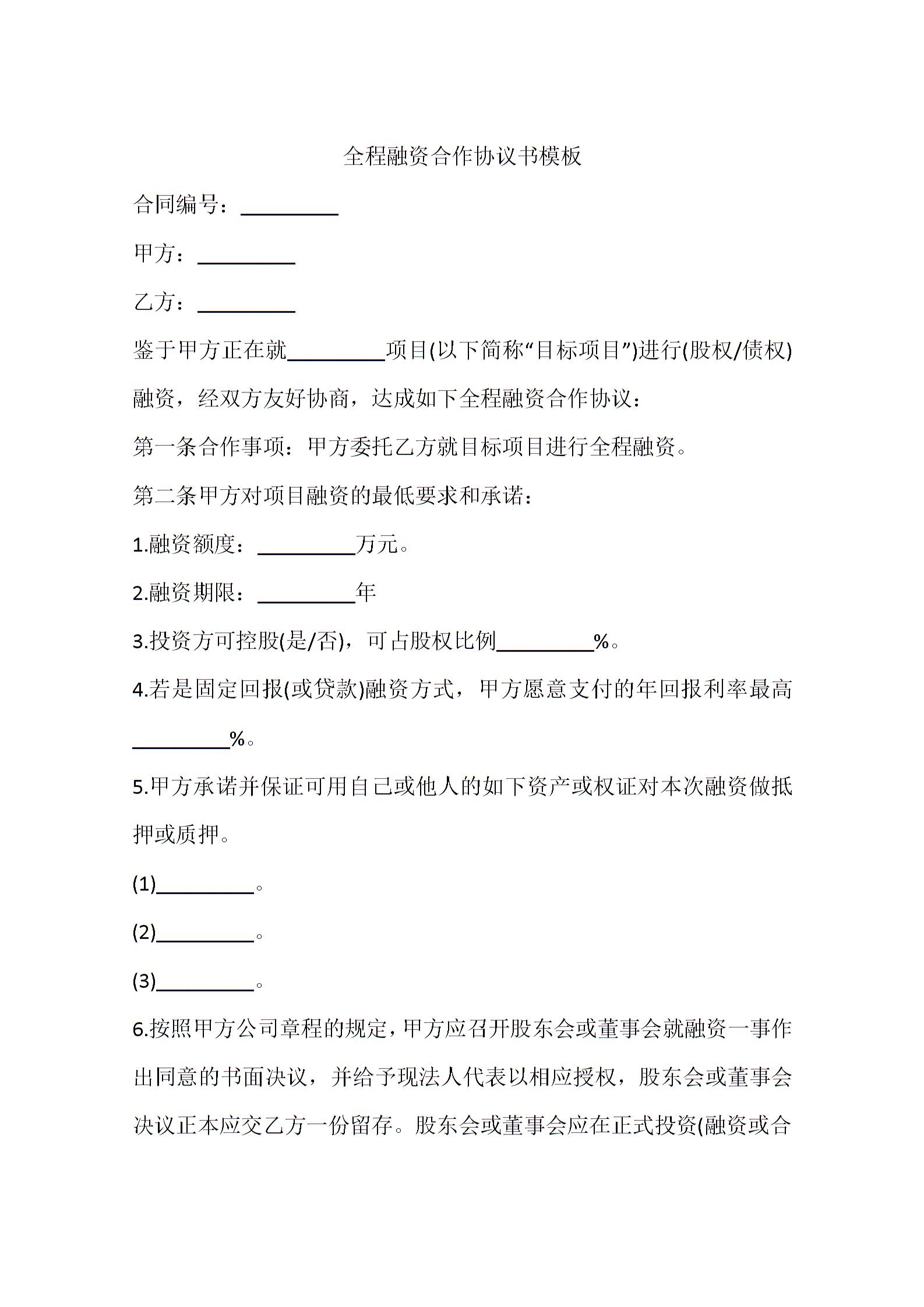 全程融资合作协议书模板