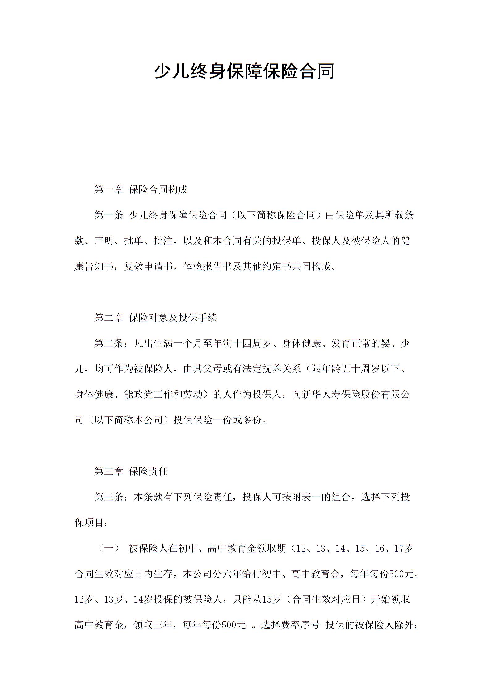 保险合同-少儿终身保障保险合同范本