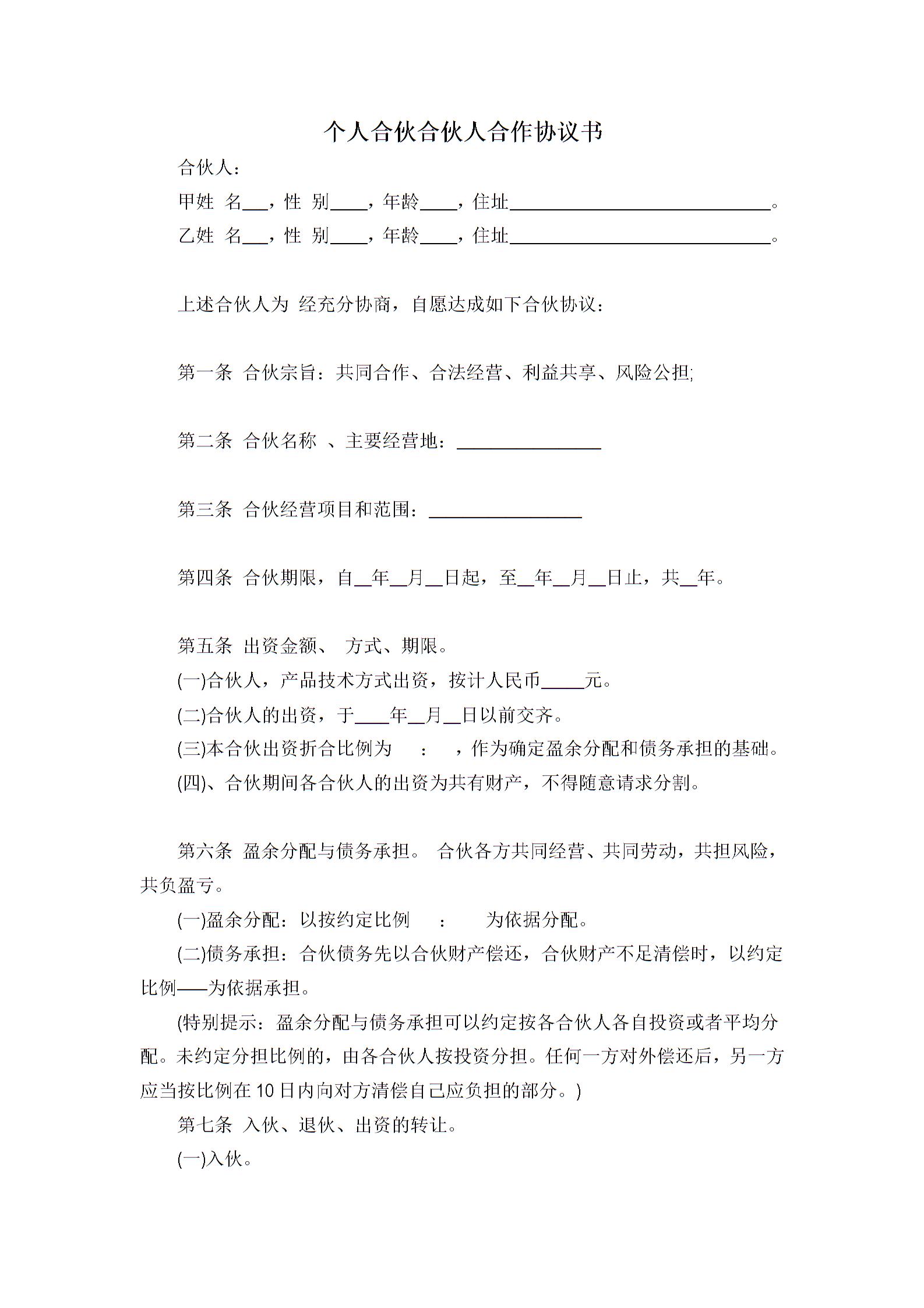 个人合伙合伙人合作协议书